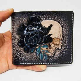 » A-Store « » Seller Profile « » Feedback profile « » Send us a message « Men's Handmade Leather Wallet skull with black peony Unisex All our products are made entirely by hand. From cutting to sewing. !!! We remind you that this is completely handmade, so some of the nuances, such as the tone of the color scheme, the minimum details, may differ. !!! Handmade wallet made of genuine Italian vegetable tanned leather, leather thickness 2 mm. Drawing techniques pyrography and embossing followed by painting. Wallet painting takes place in several stages, at first it is impregnation with various materials that prevent the wallet from cracking and give the skin elasticity, then color is applied. After painting, the wallet is covered with varnish to protect the paint from abrasion; the varnish also protects the wallet from moisture and gives the product a noble shine. Perimeter stitching is done only by hand, with a waxed thread with a saddle stitch. Only a hand seam makes the product as strong and durable as possible. The size of the folded wallet is 9.5 * 11 cm. Inside, for the lining, haberdashery leather is used, elastic but strong. This leather allows you to fill the wallet with a large number of cards and bills, but keep the wallet compact. Two compartments for banknotes, coin box, 4 compartments for cards. The wallet closes with an inner button. (if you wish, you can skip the order). You can also order other wallet content from us (for example, instead of a coin compartment, there are 4 more compartments for cards) and choose a color scheme for the picture. We use in our work only high quality materials and a professional line of paints such as Fiebings and Eco-Flo. We are constantly learning to improve our skills and make leather goods better and better. Our products are bright and soulful leather goods. These are things that give joy. Each piece is packed in our branded craft bag with a logo. We offer exclusive items of a higher quality level than a mass product. This is due to the fact that manual work implies strict control at all stages of production and an individual approach. It is thanks to this approach that " things with a soul " come out of the hands of our masters, which will serve their owner for more than one year. SHIPPING RETURN POLICY 30 DAYS GUARANTEE! We guarantee you complete satisfaction with all my products. If you receive an item you did not order or if an item you ordered is received damaged or defective, I will refund you the price you paid for it or replace it with identical one. Item for returning must have the original tags and packing, otherwise it won't be accepted. DO NOT ship the item back to us without contacting us first. Return shipping is responsibility of buyer. FEEDBACK Please leave 5 Star positive feedback when you receive your order. Your 5 Star positive feedback is very IMPORTANT to me which makes me keep improving. Before leaving any neutral or negative feedback, please contact me and give me the opportunity to resolve your problem and MAKE YOU A HAPPY CUSTOMER.