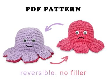 Printable PDF-file 9 pages long with 27 pictures ! ! This listing is not for a finished product or a paper pattern! PDF PATTERN ONLY ! ! This pattern doesn’t contain crochet lessons. Crochet this product requires basic crochet skills. Difficulty: Easy Language: English Terminology: USA FINISHED SIZE: see pics. You will need: see pics. This pattern is for personal use only. Don’t sell and don’t share, please. You are welcome to sell items made of this pattern. I would be happy if you link back to my shop and give credit to me as the designer. Amigurumi pattern, for new beginners, reversible octopus, Pdf easy soft toy, Cute crochet animal, DIY photo tutorial, Ocean themed study, nautical funny decor, office angry emotion, safe happy sad toy, under the deep sea, mood emo creatures, double sided octopod