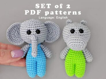 ! ! ! This listing is not for a finished product or a paper pattern! PDF PATTERNS ONLY ! !  This pattern doesn’t contain crochet lessons. Crochet this product requires basic crochet skills. Elephant: printable PDF-file 11 pages long with 35 pictures. Hippo: printable PDF-file 10 pages long with 33 pictures. Thank you for choosing my pattern! I created this pattern specifically to minimize sewing. The legs, body, and head are one piece. Difficulty: Easy Language: English I use USA terminology for my pattern. FINISHED SIZE: approx 3.9-4 inches (10 cm) with the yarn I used (YarnArt Ideal) and hook 1.9-2.0 mm You can use any yarn (wool, acrylic, etc). If you use different yarn, the toy will be bigger or smaller and you will need more or less yarn than stated in the pattern. Also you will need a hook and eyes of another size. You will need: (see pictures) • Yarn • Safety eyes • Crochet hook • Needle for sewing in ends, stitching pieces together. • Polyester fiberfill for stuffing • Pins • Scissors This pattern is for personal use only. Don’t sell and don’t share, please. You are welcome to sell items made of this pattern. I would be happy if you link back to my shop and give credit to me as the designer. Amigurumi pattern, Pdf pattern, Pdf crochet tutorial, Easy crochet pattern, Beginners patterns, Animal toy for baby, DIY photo tutorial, Crochet elephant, Jungle plush stuffed, safari animals, Baby gift hippo, gift for new mum, Funny animal toy