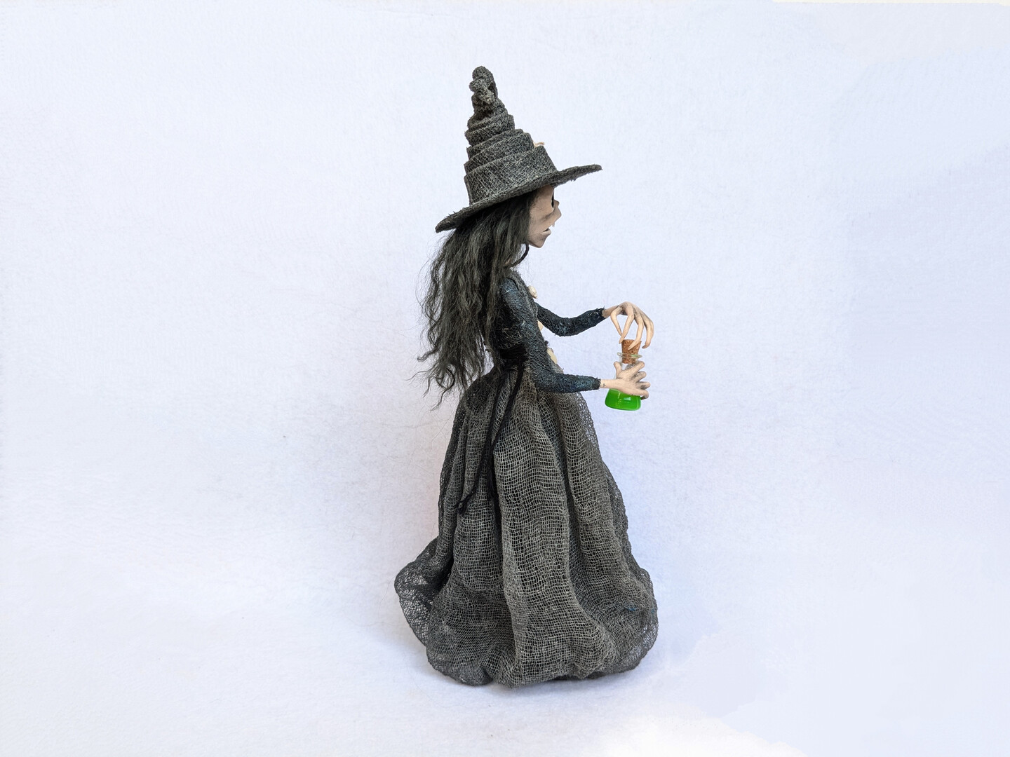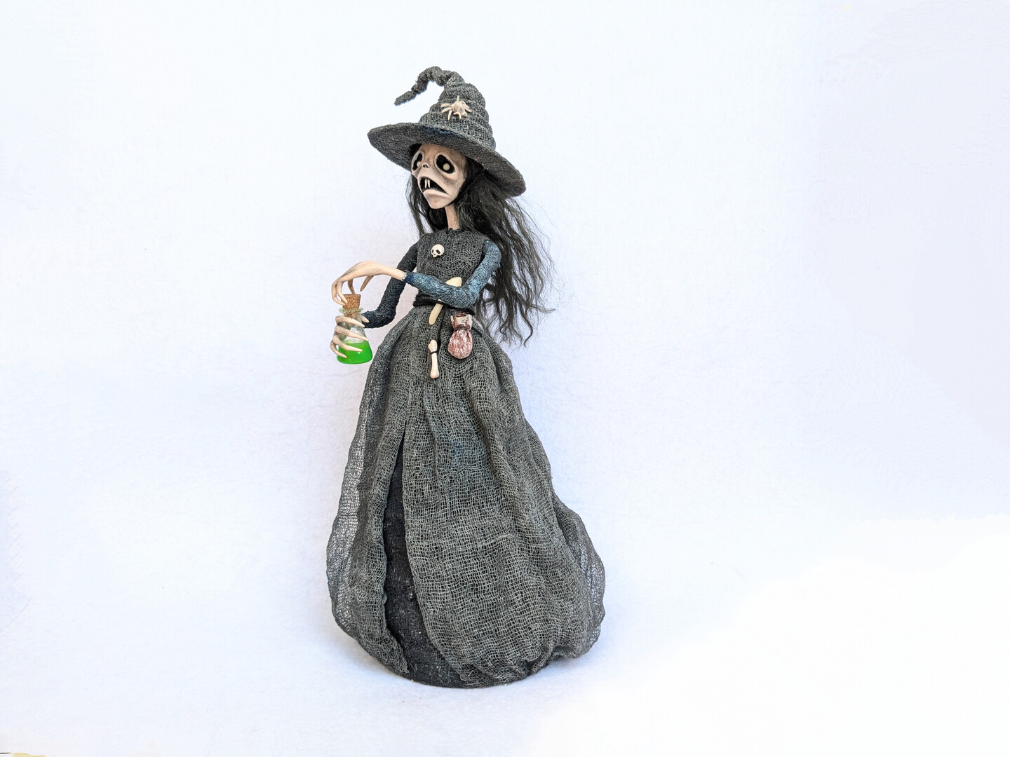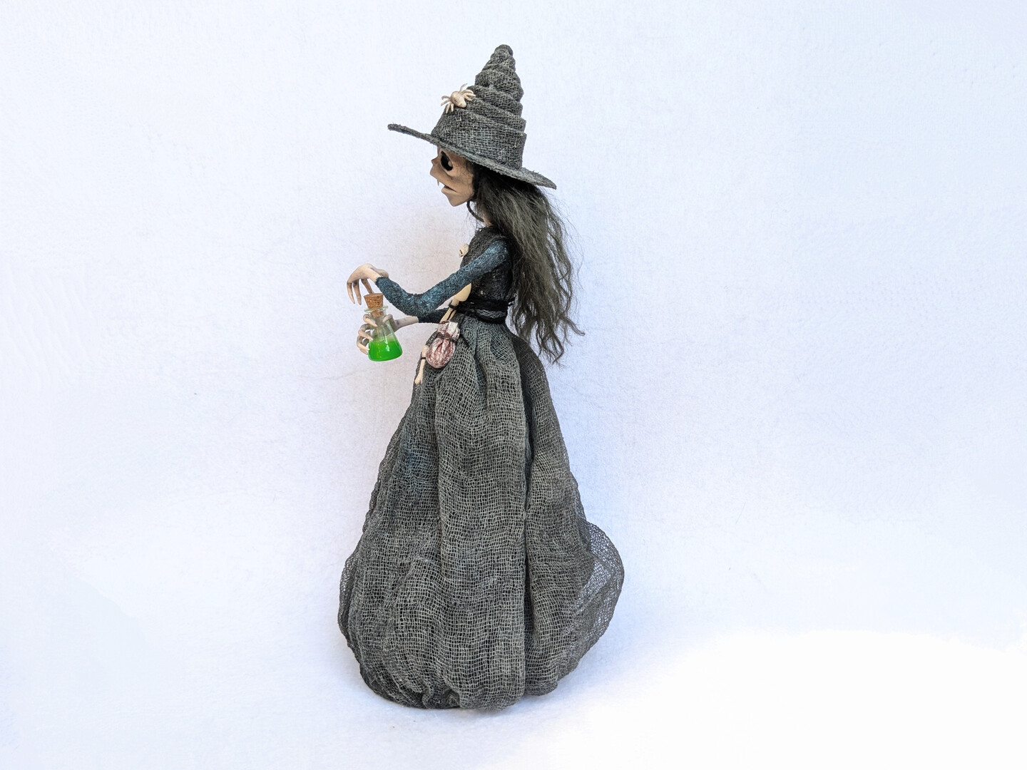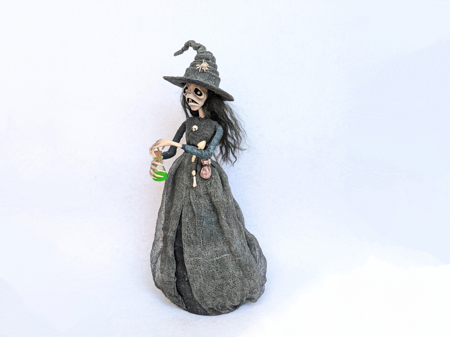 I sculpted her face and hands with polymer clay. The tiny skull-brooch, bone and mushroom are sculpted as well and painted with acrylic paints. The hair of Witch is made of wool of a goat. She also has a leather pouch and a vial with poison.