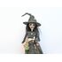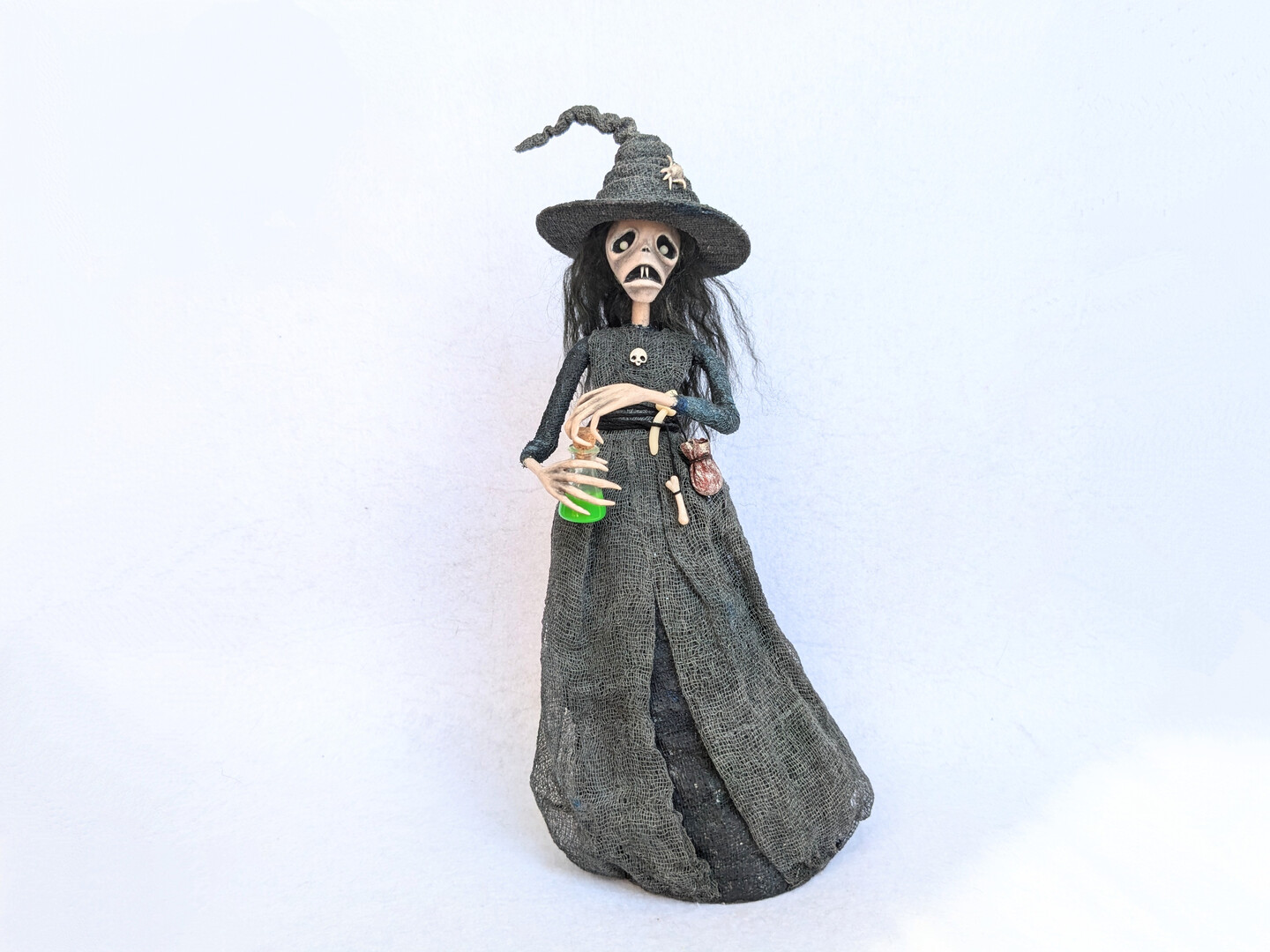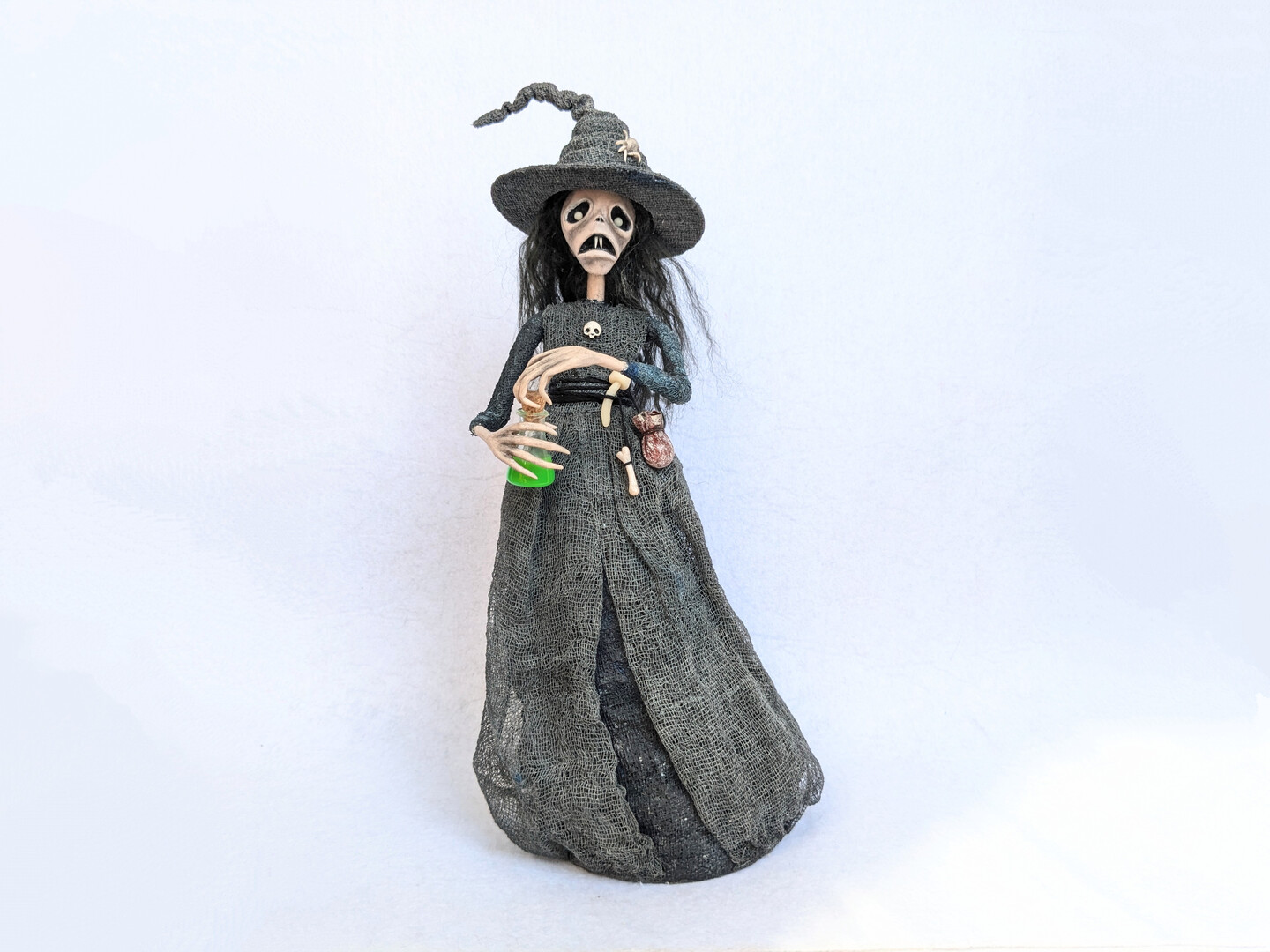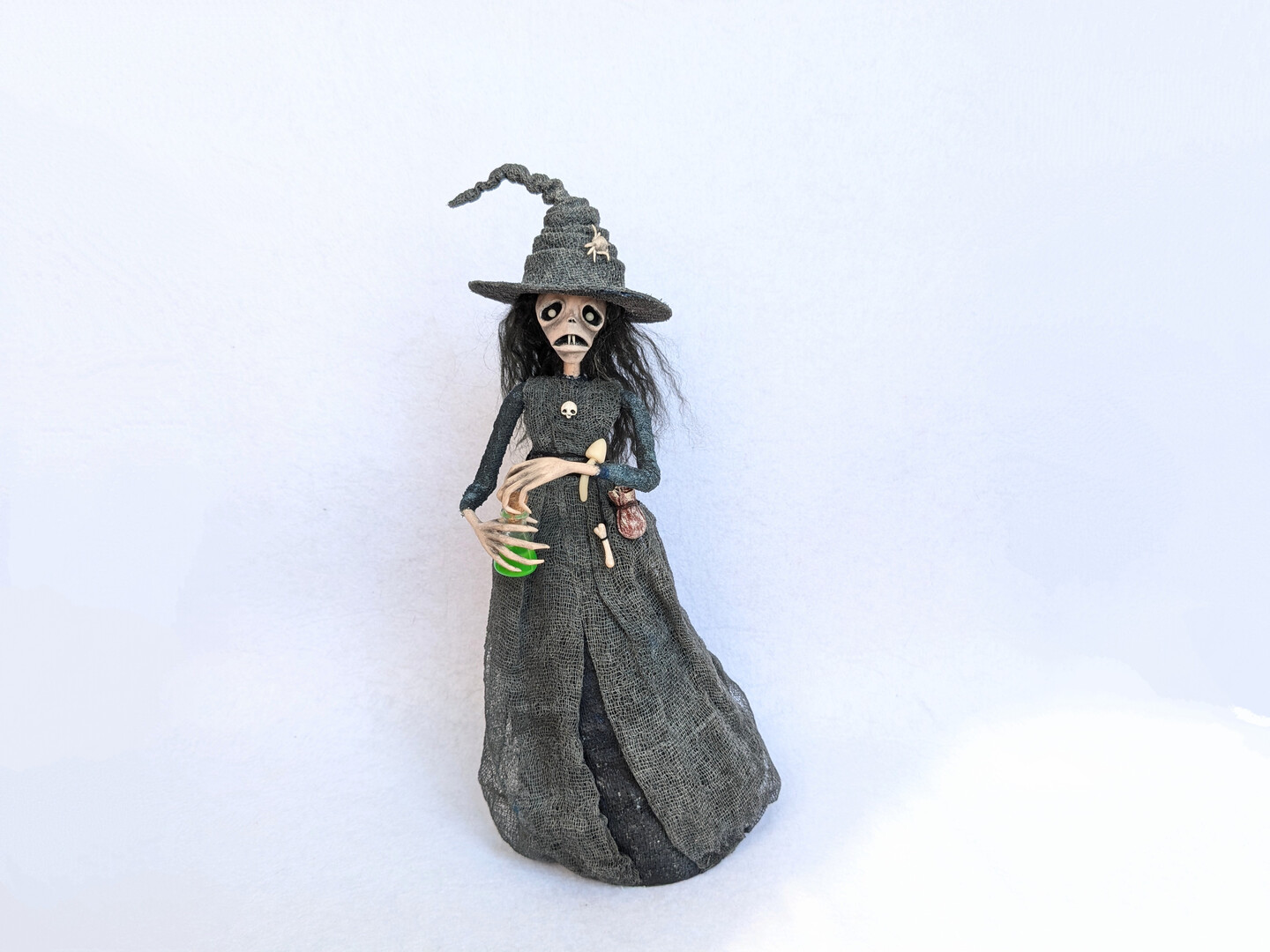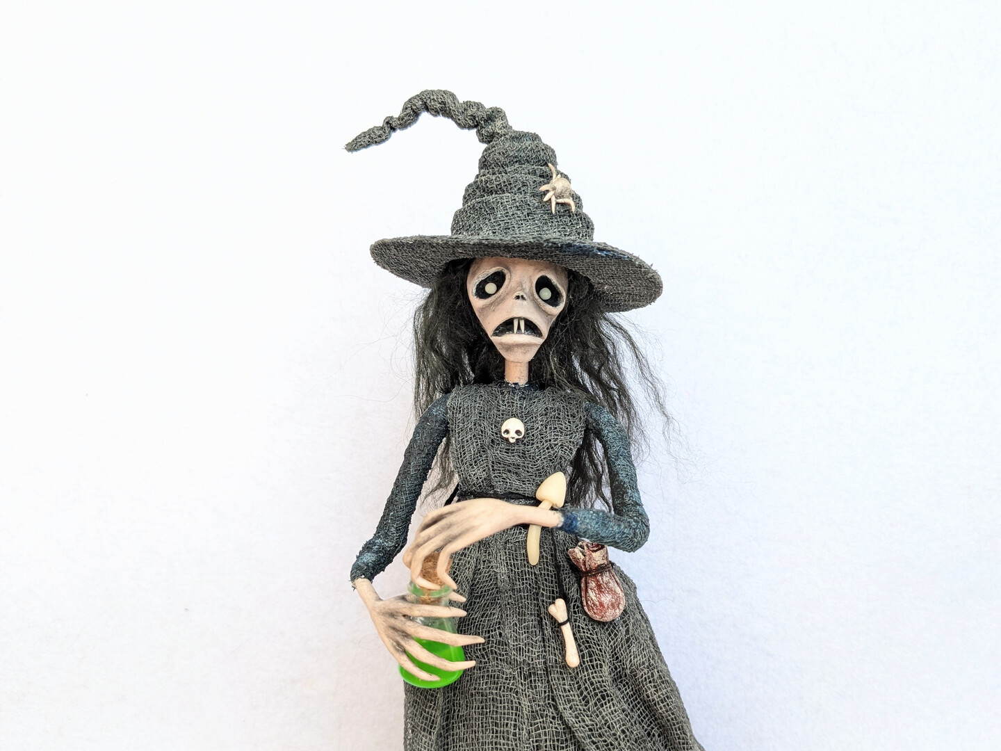 I sculpted her face and hands with polymer clay. The tiny skull-brooch, bone and mushroom are sculpted as well and painted with acrylic paints. The hair of Witch is made of wool of a goat. She also has a leather pouch and a vial with poison.