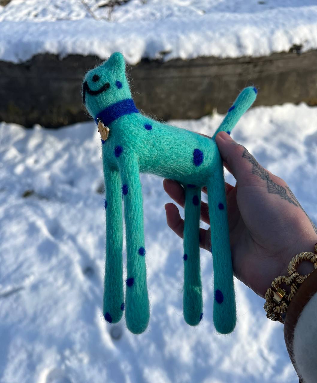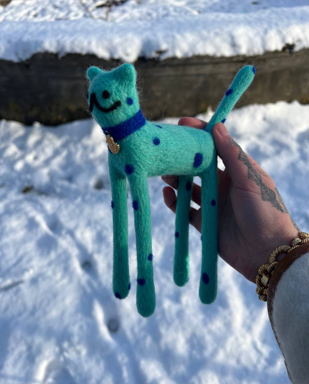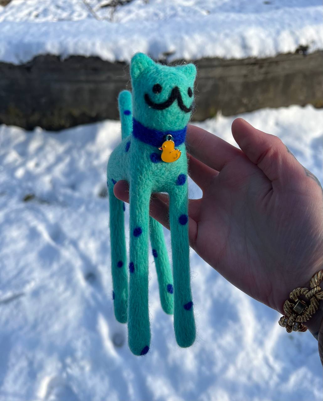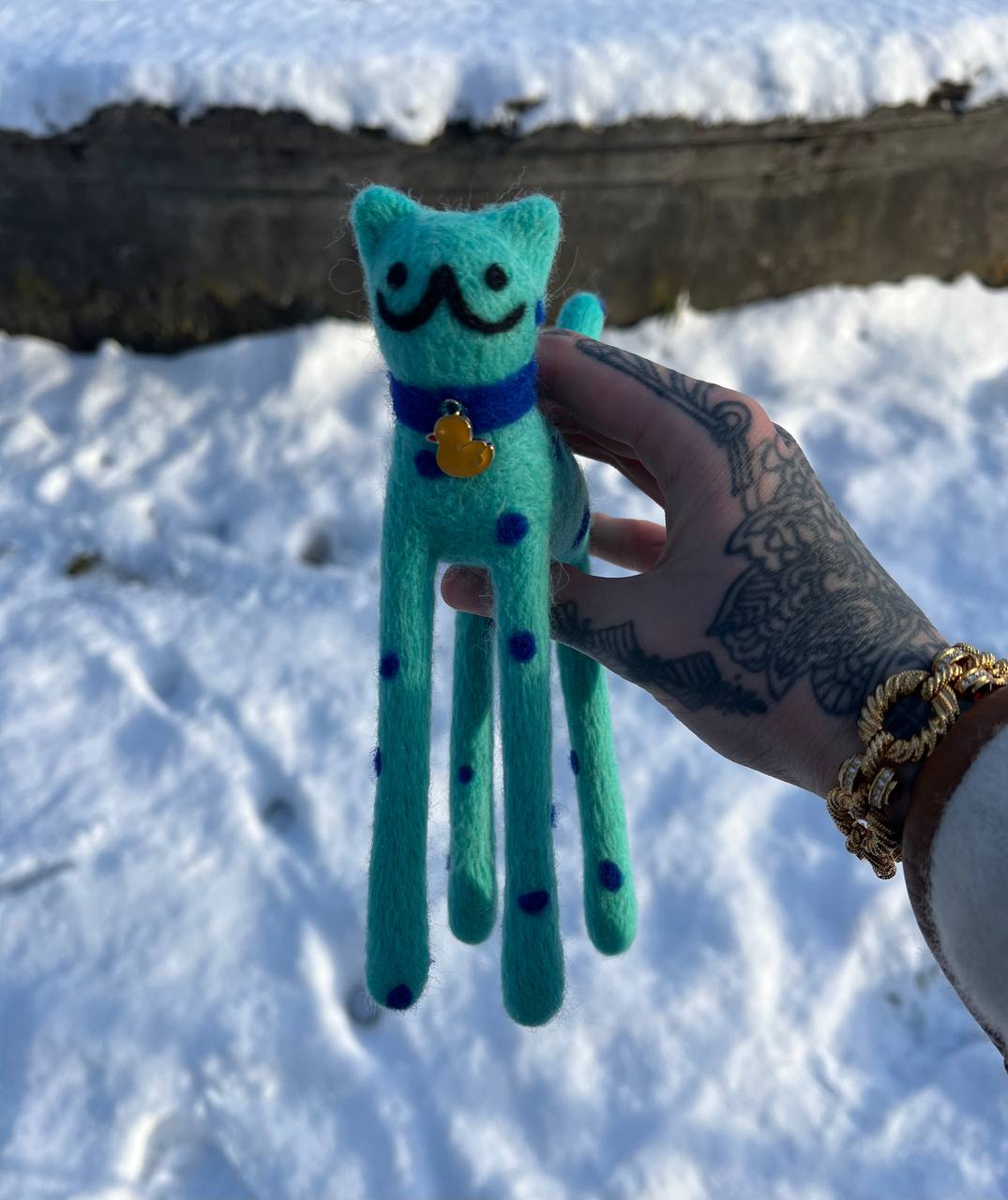 This adorable cat Mirage is made of fine merino wool by dry felting technique. Collar is embellished with metal bead. The cat is 6 inches high. Do not wash, only clean dry.