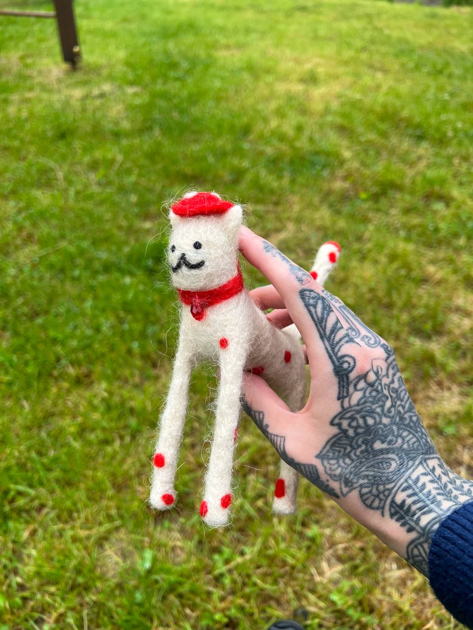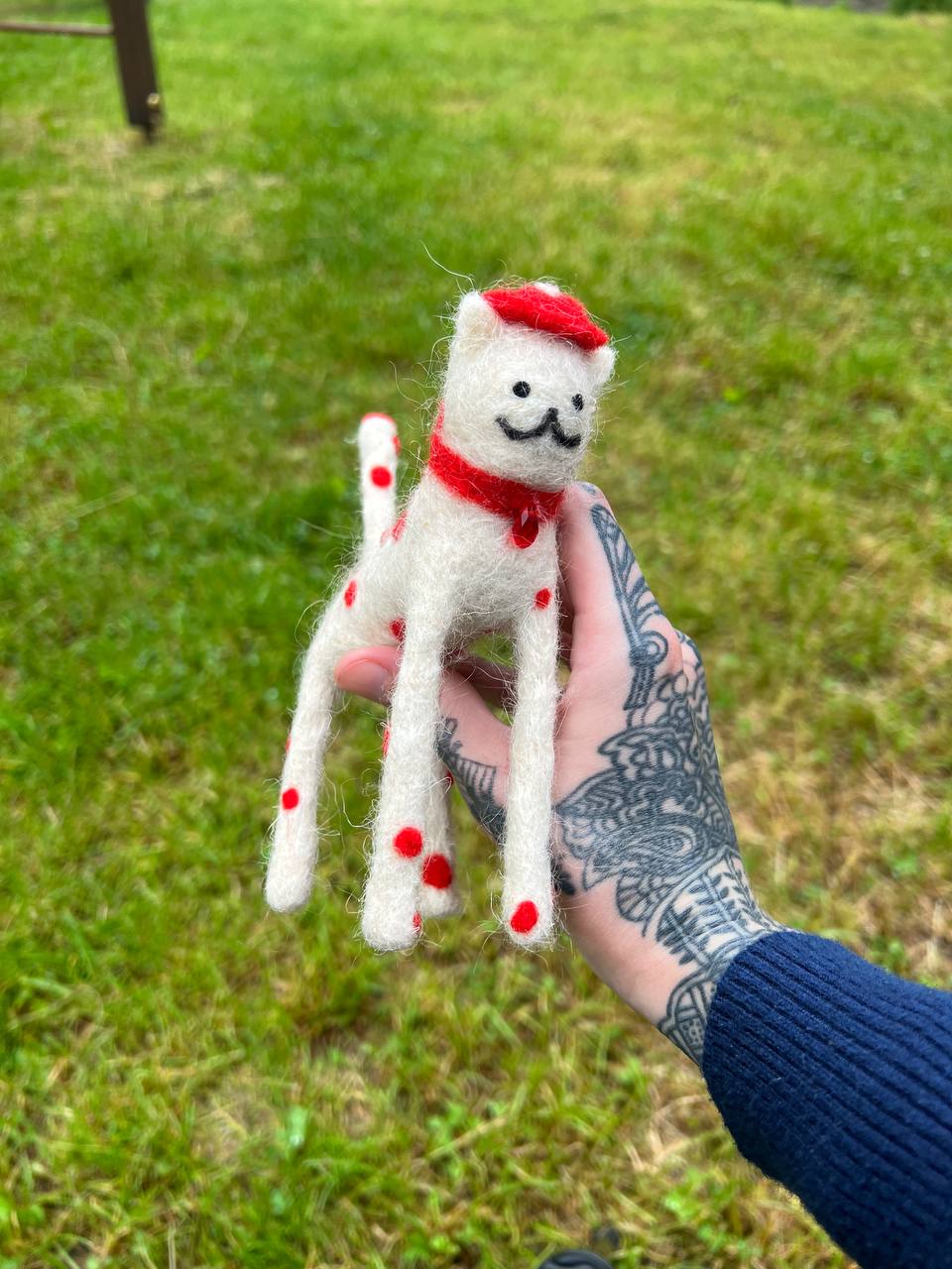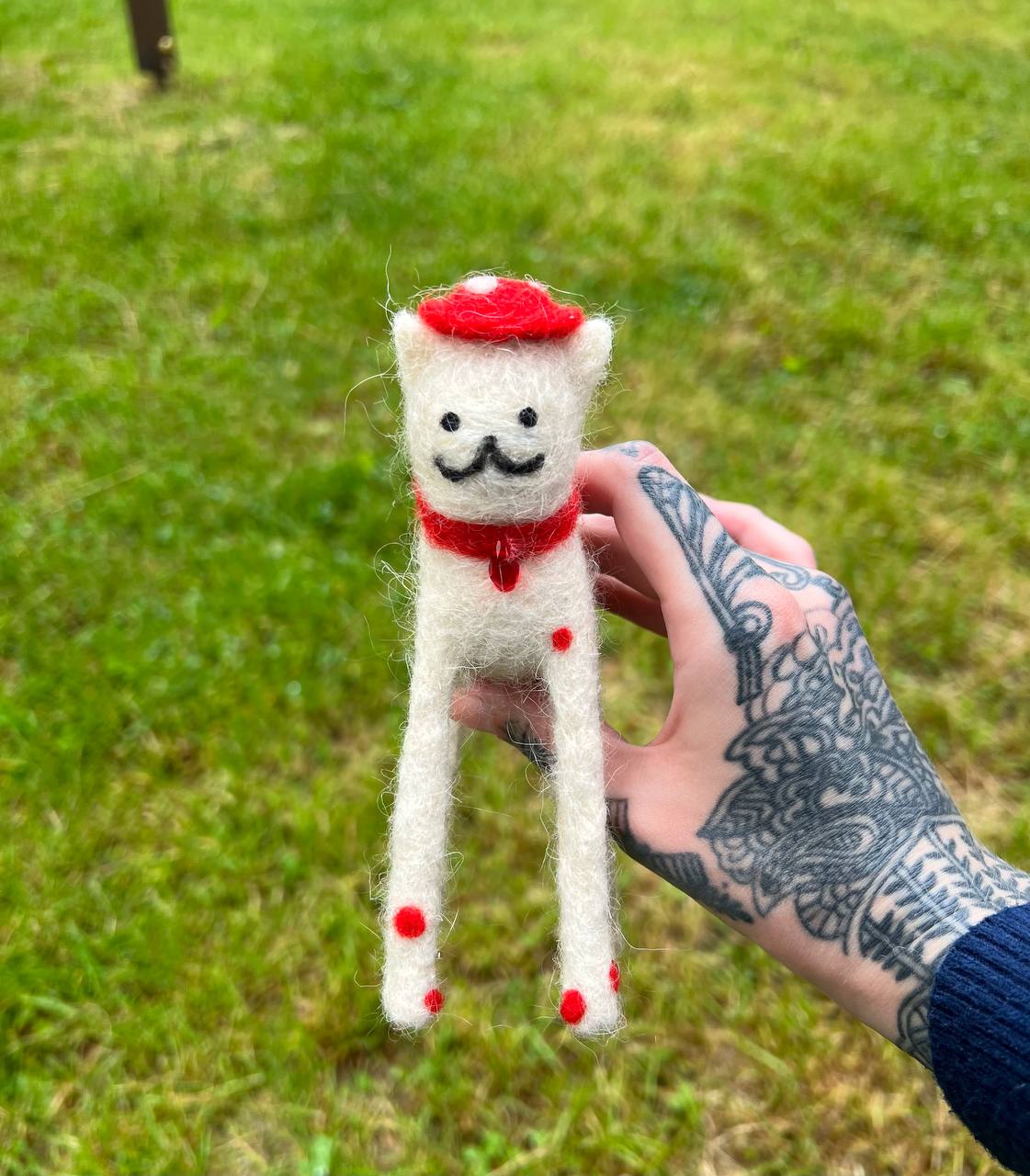 This adorable cat Parisienne is made of fine merino wool by dry felting technique. Collar is embellished with glass bead. The cat is 6 inches high. Do not wash, only clean dry.