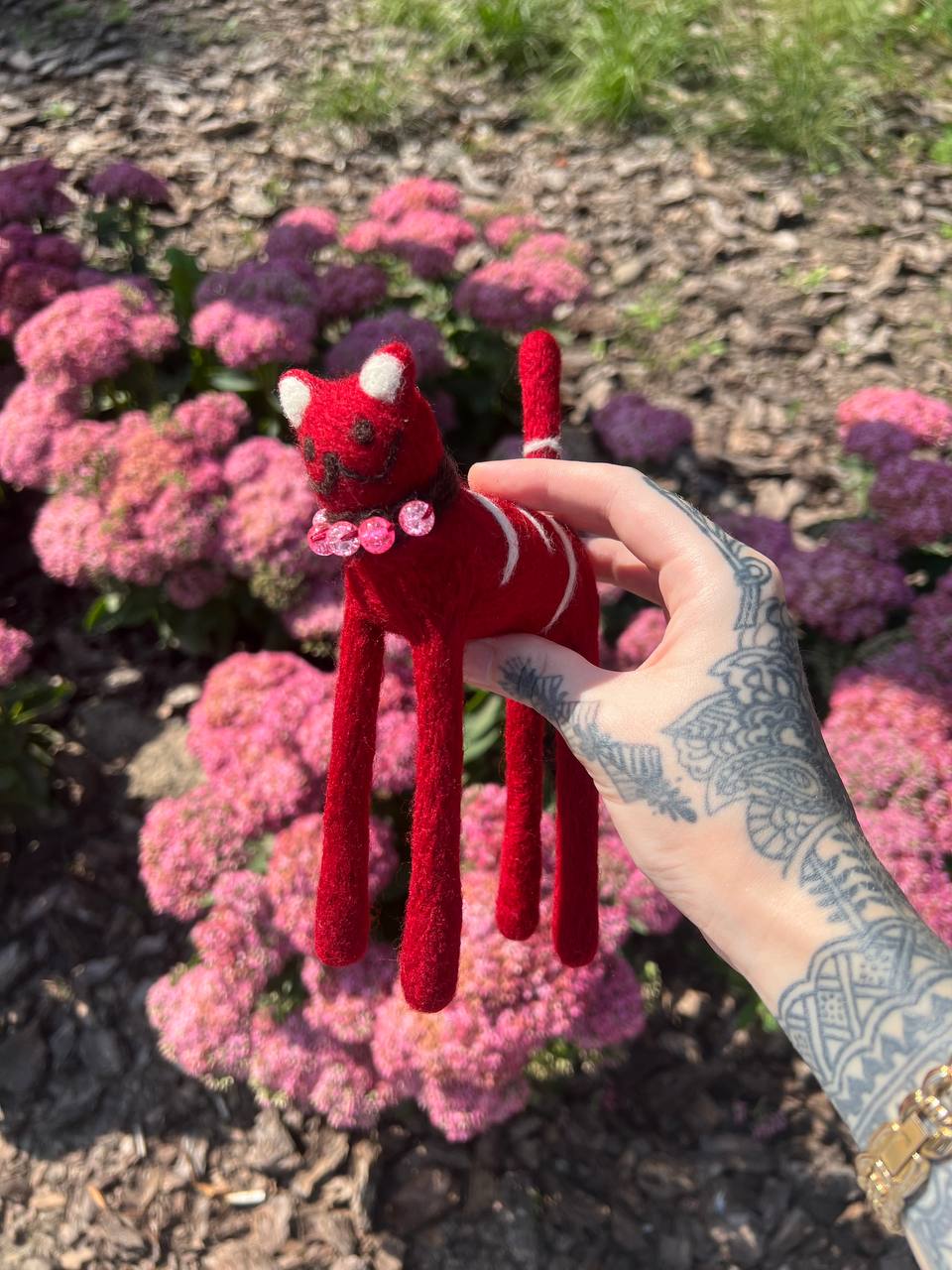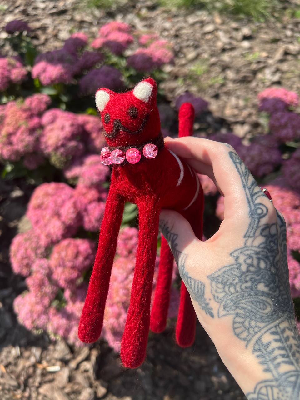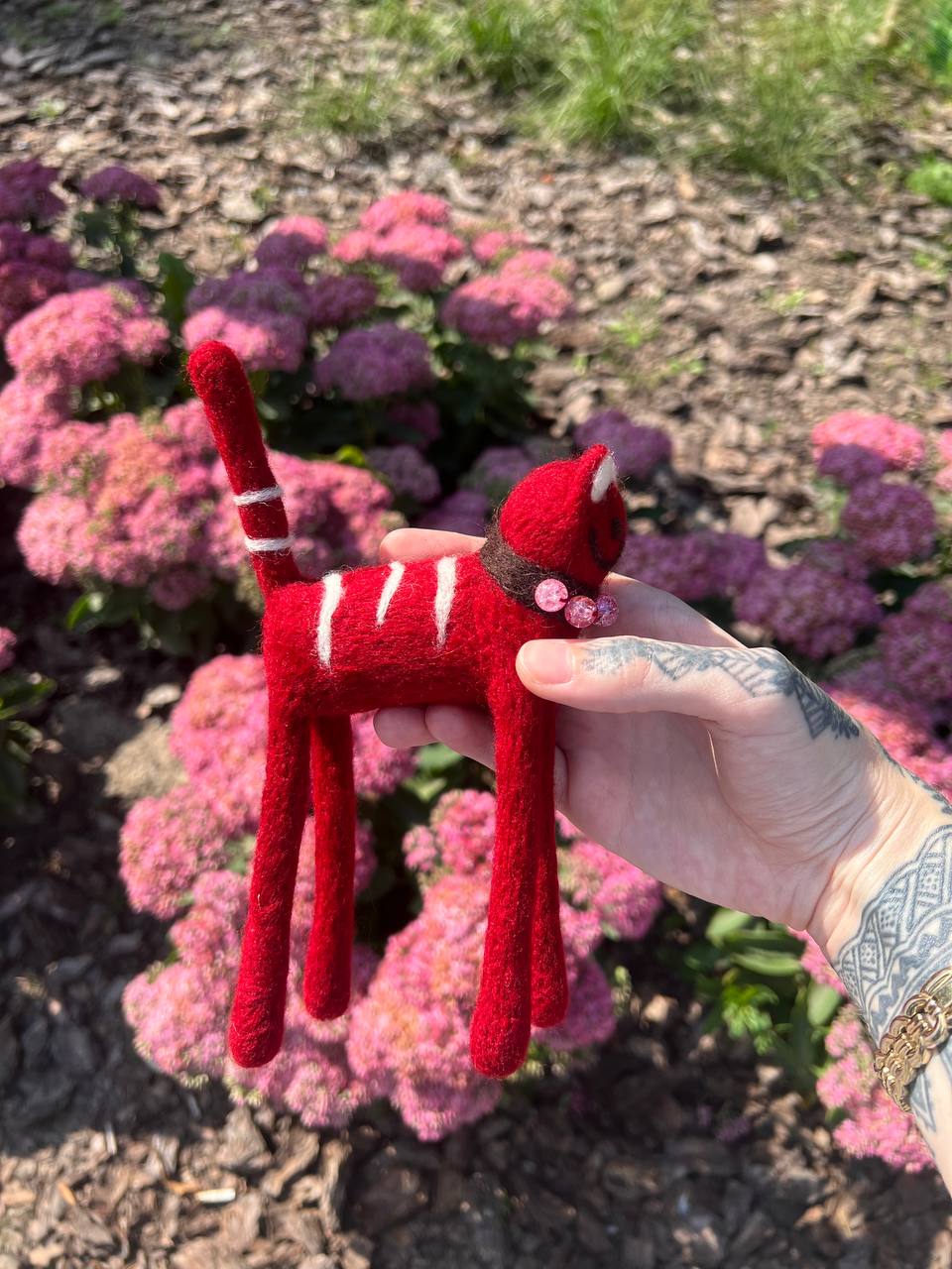This adorable cat Rosie is made of fine merino wool by dry felting technique. Collar is embellished with glass beads. The cat is 6 inches high. Do not wash, only clean dry.