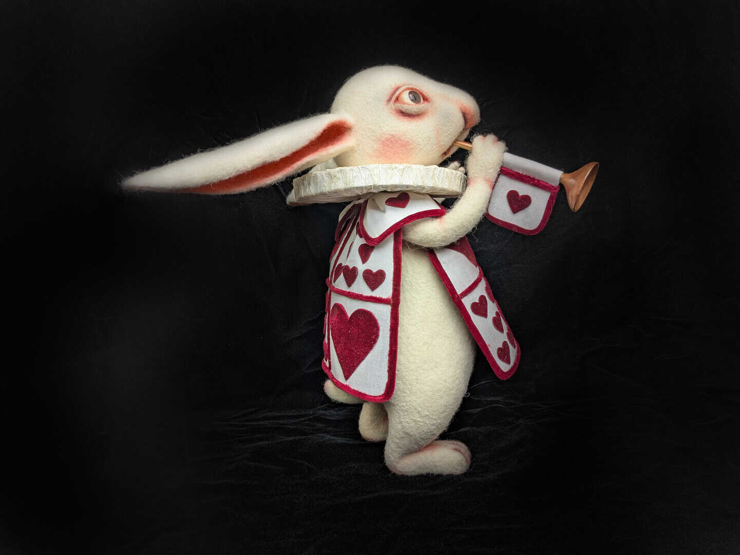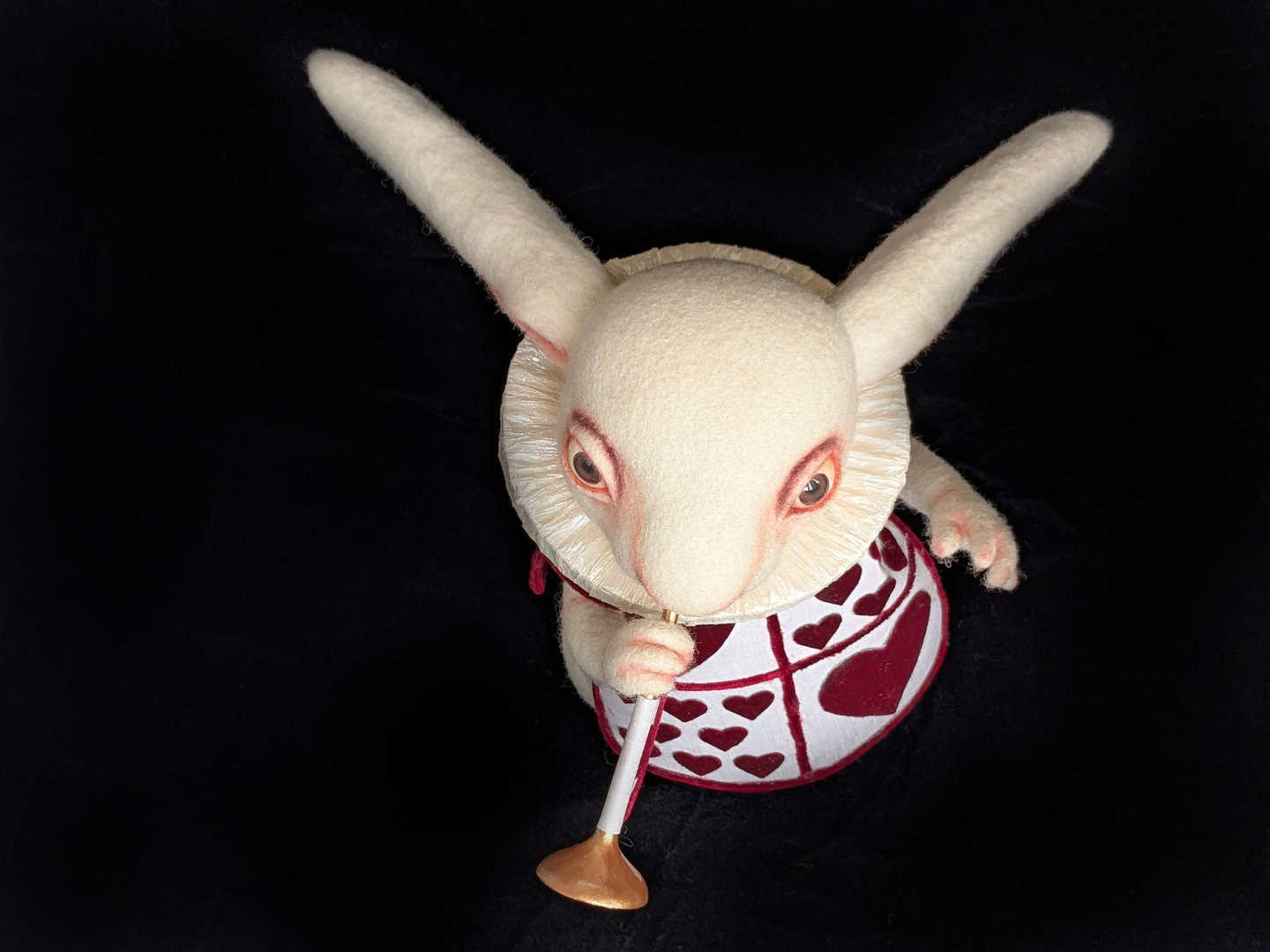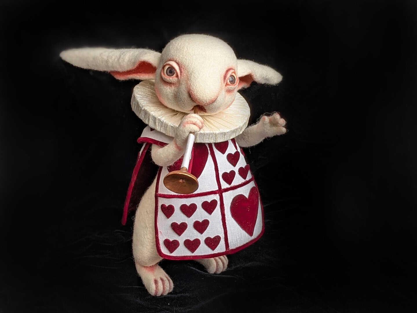 White rabbit/ Alice in Wonderland/ Needle felted sculpture/ Felted animal/ Red eyes/Rabbit with trumpet/ A card