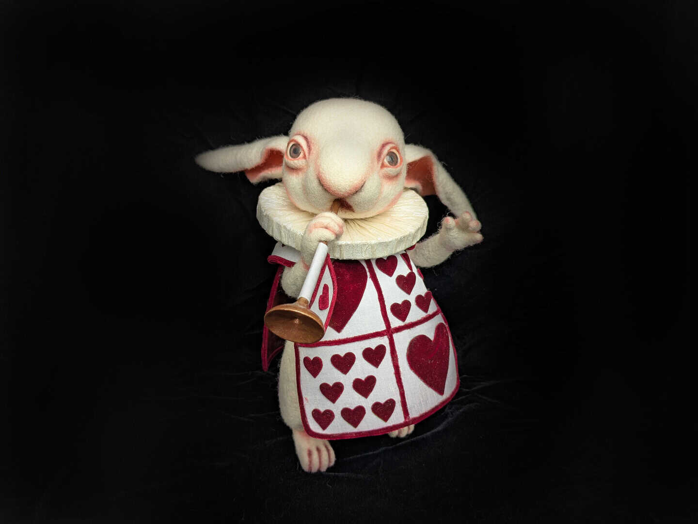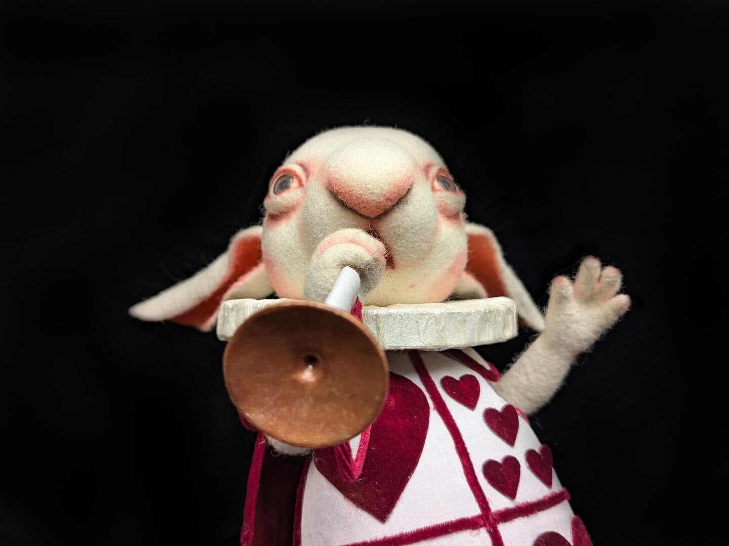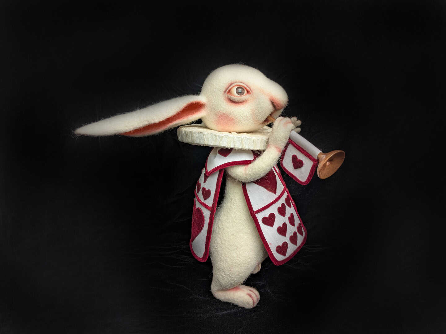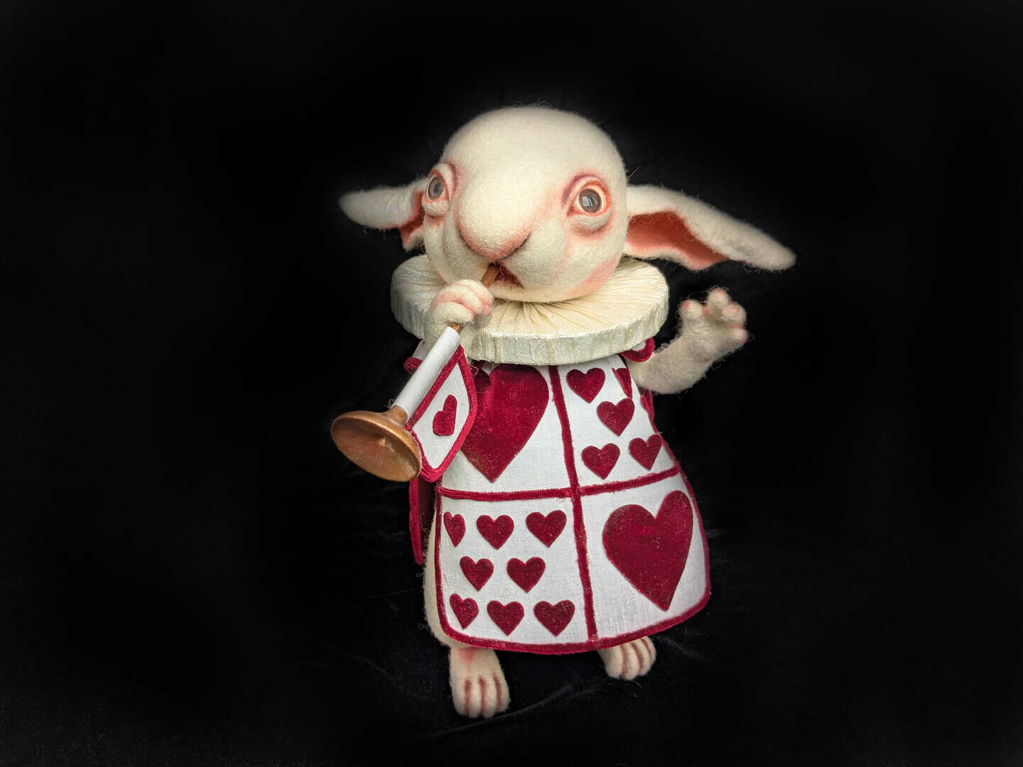 White rabbit/ Alice in Wonderland/ Needle felted sculpture/ Felted animal/ Red eyes/Rabbit with trumpet/ A card