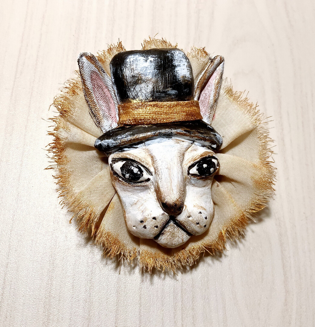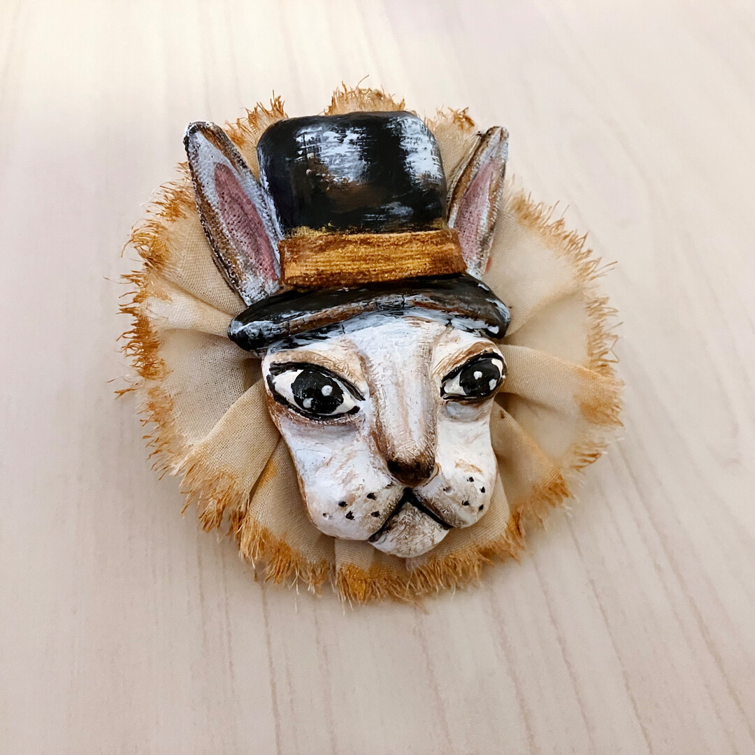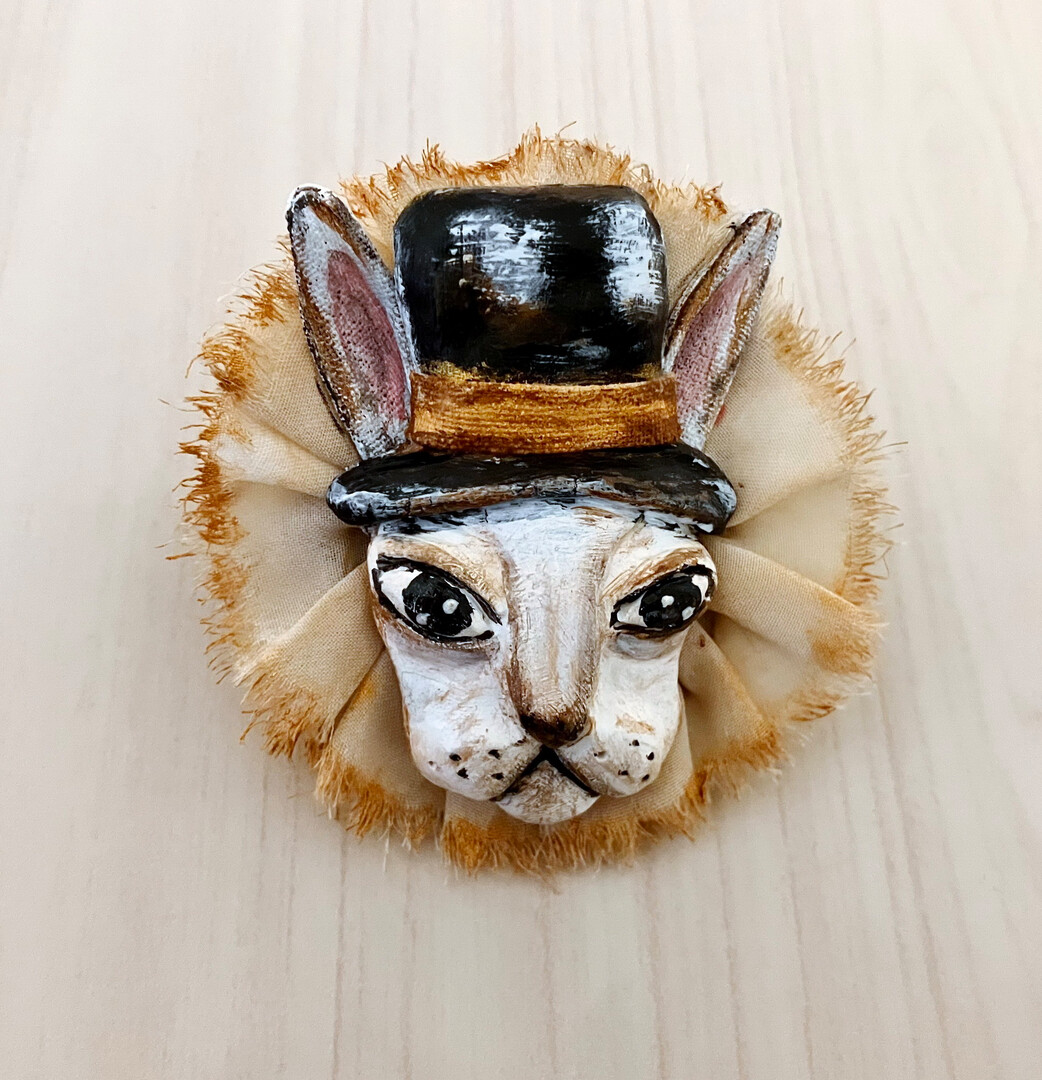 Statement jewelry White rabbit pin brooch is made from polymer clay and cotton fabric, hand painted with acrylic paints and varnished on top .Alice in wonderland artisan jewelry rabbit brooch can be worn on a coat, denim jacket, sweatshirt, dress and jacket, on a cap, hat or backpack.