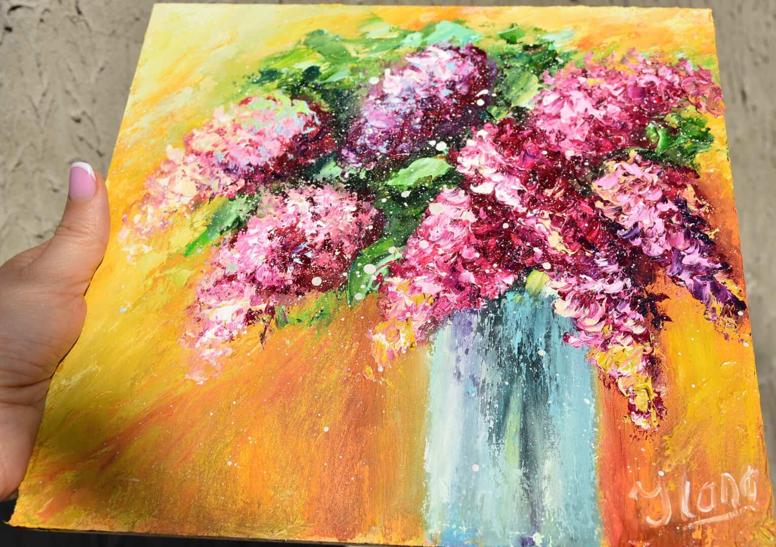 Lilac flowers in a vase, square miniature painting for interior 10 by 10 inches in size