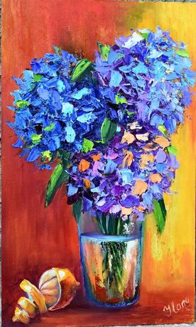 This floral oil painting on panel captures the floral mood of a vibrant of blue forget-me-nots. It will decorate a living room or dining room and makes a wonderful gift for art lovers.