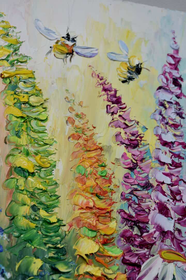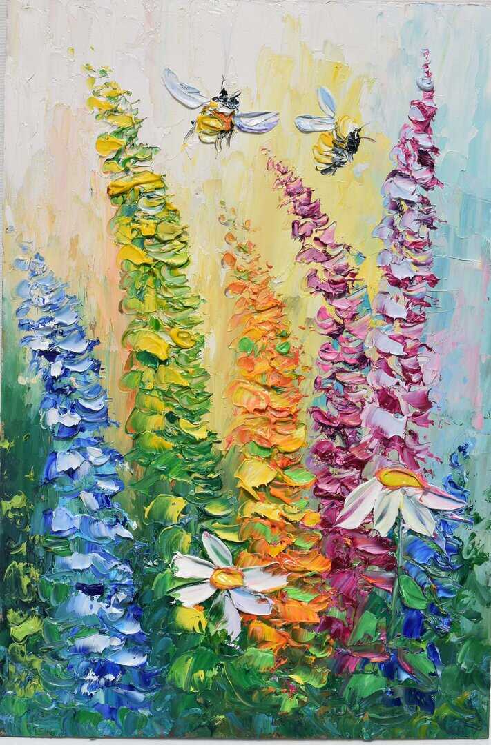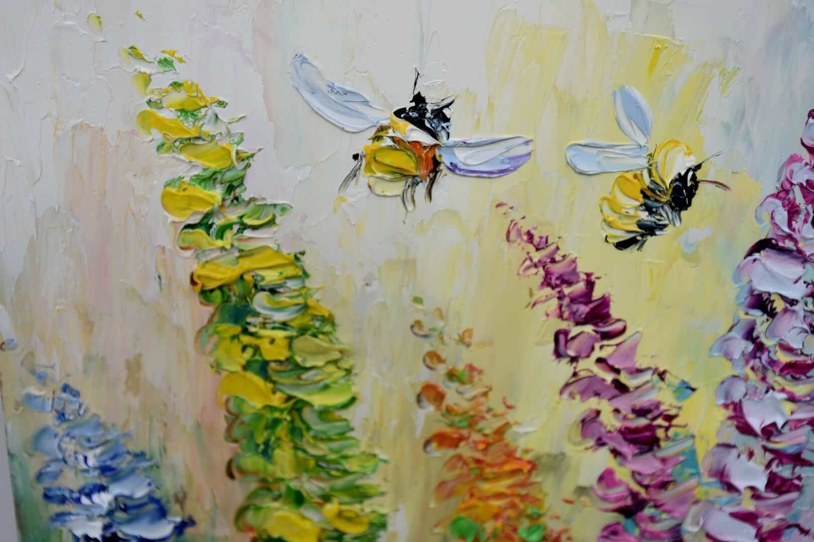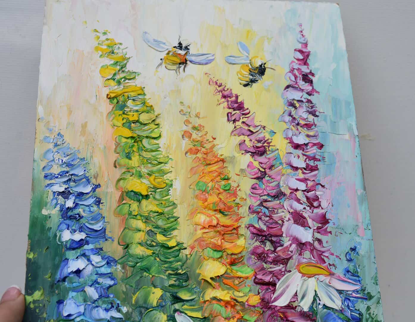 Meadow flower landscape with bees., oil painting with impasto 12 by 8 inches in size