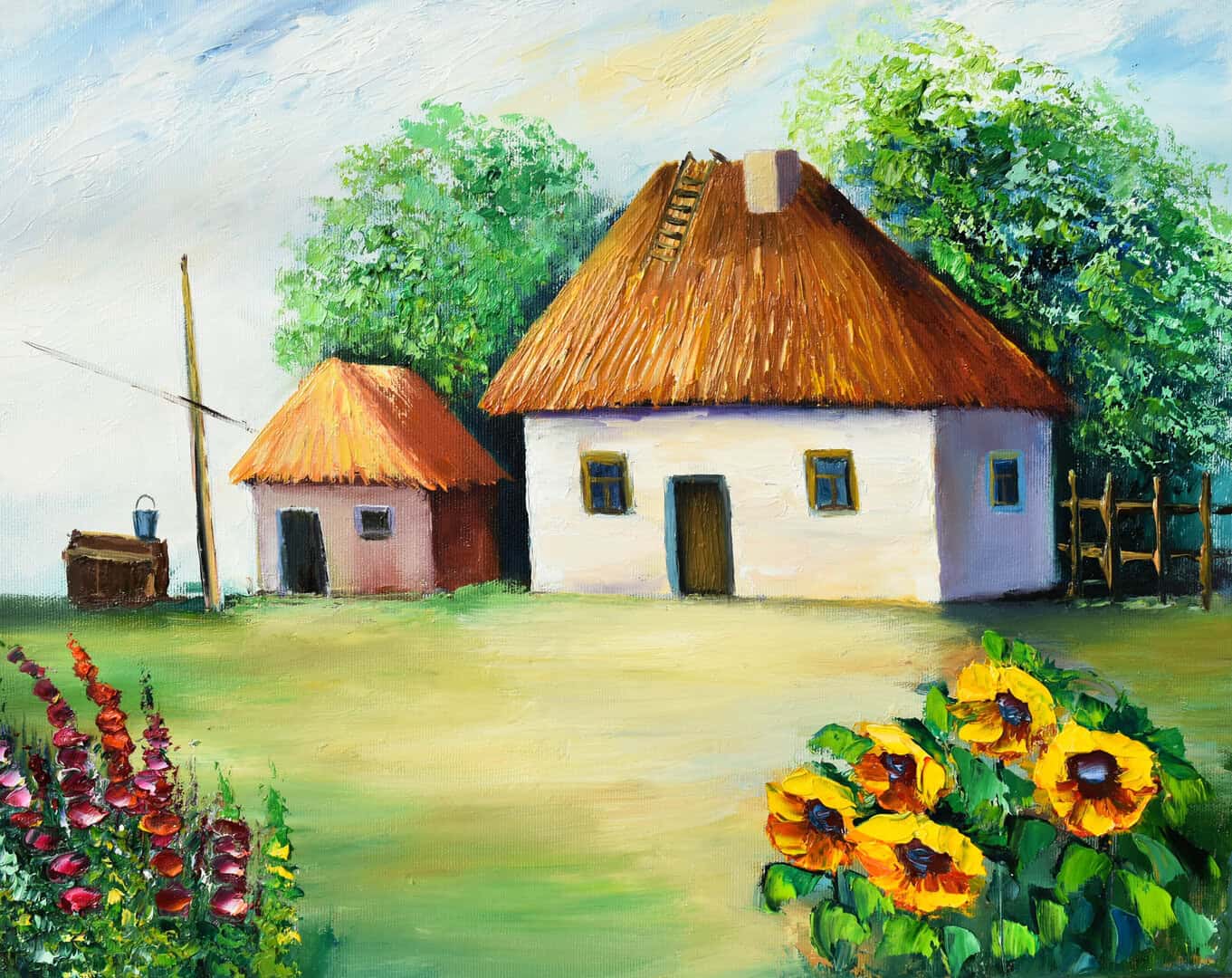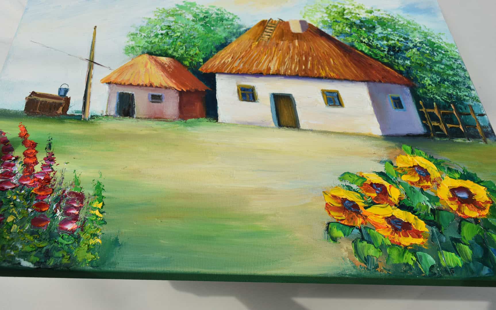 This oil painting depicts a rural landscape with a farmhouse. It will decorate a living room or dining room and makes a wonderful gift for art lovers.
