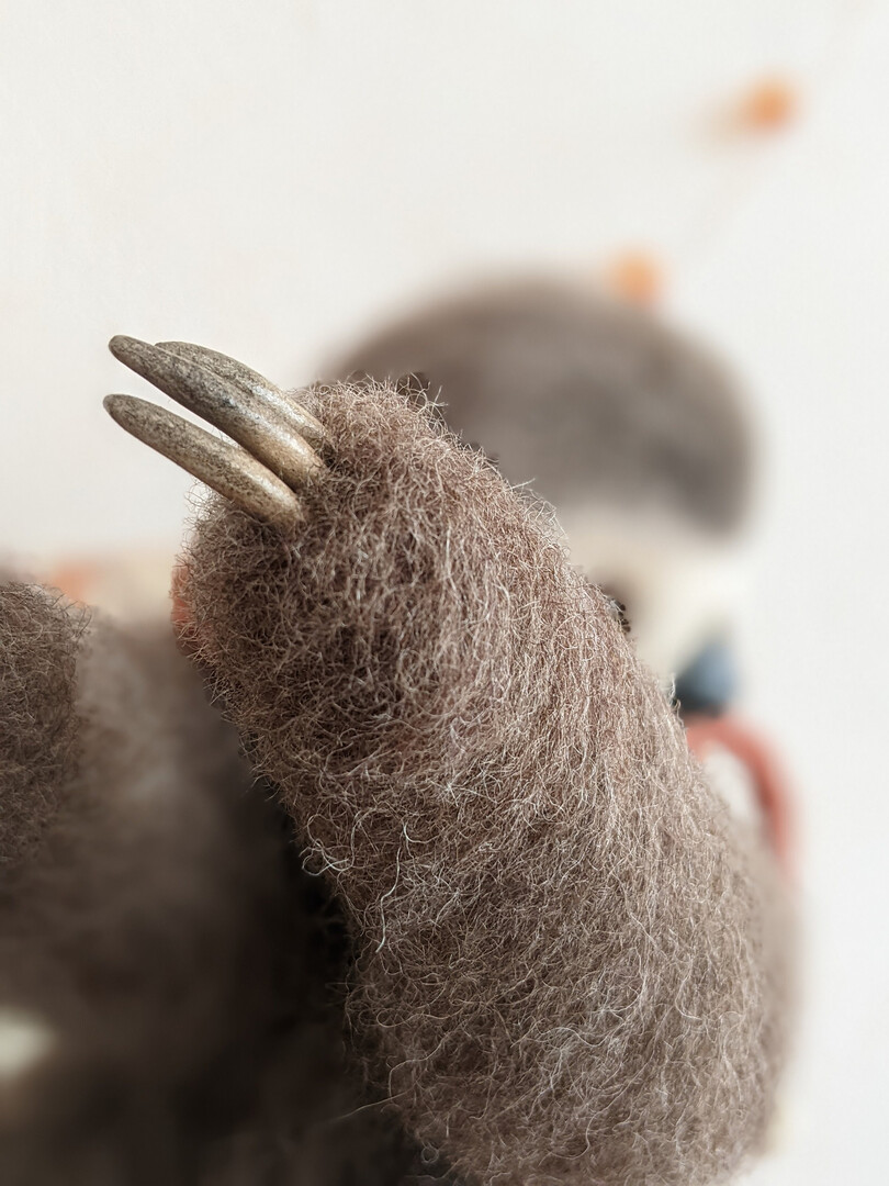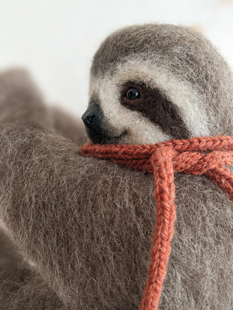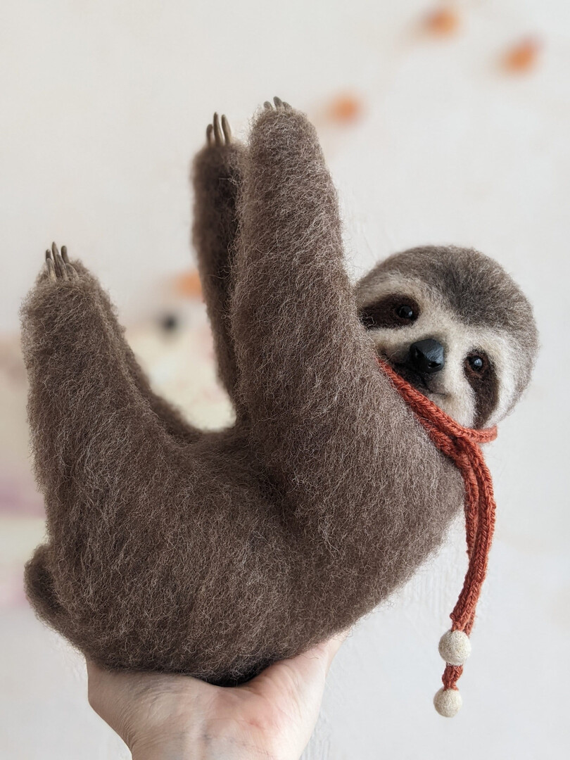 Needle felted sloth made of wool in dry felting technique. Fully hand made. Has a wire inside. Claws and nose made of paper clay (La Doll), covered with acrylic paints and soft pastel. Scarf knitted of woll yarn, can be removed.