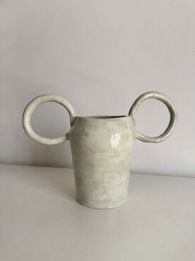 Handmade ceramic vase is a piece of modern pottery, perfect for adding an artistic touch to your home decor. Featuring two large circular loop handles, this sculptural vase combines minimalism with a bold, playful design. The soft white glaze gives it a natural and organic look, making it easy to style in both modern and rustic interiors. Details: • Material: Stoneware clay • Finish: White glaze (matte with subtle shine) • Dimensions: Ideal as a decorative vase on its own or as a statement vessel for dried flowers, pampas grass, or simple greenery. Each piece is handcrafted, so slight variations in shape and glaze make your vase truly unique Bring originality and elegance into your living space with this sculptural ceramic vase – a timeless handmade treasure.