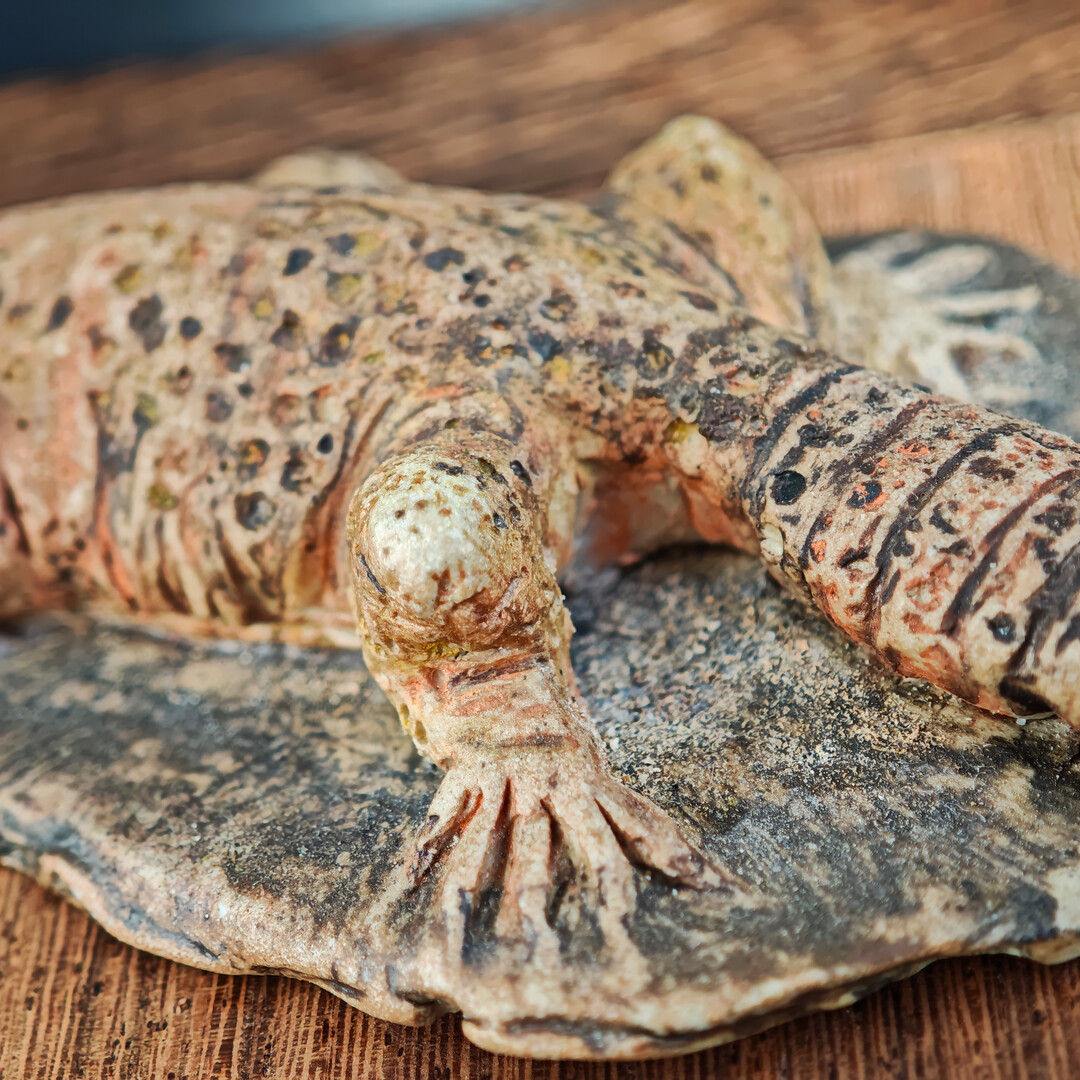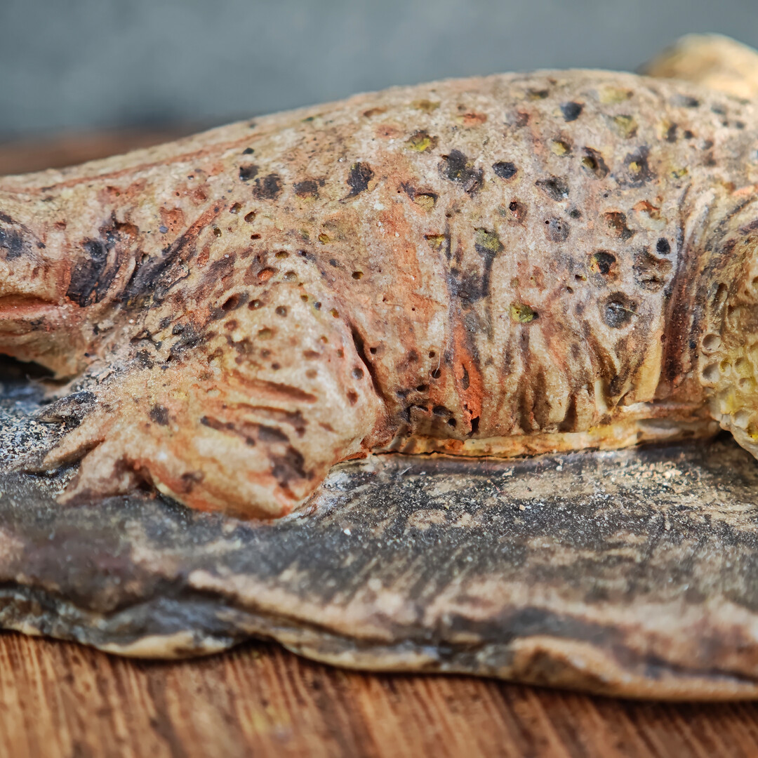 A gecko with a stand is one piece. Figure length with stand 10 cm, width 5 cm. Gecko is one of my latest works made in Ukraine. The figurine was fired in a wood-burning stove in Ukraine already during the war.