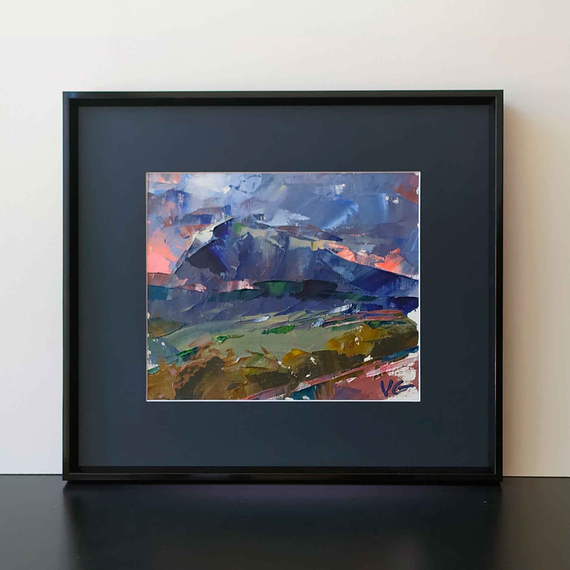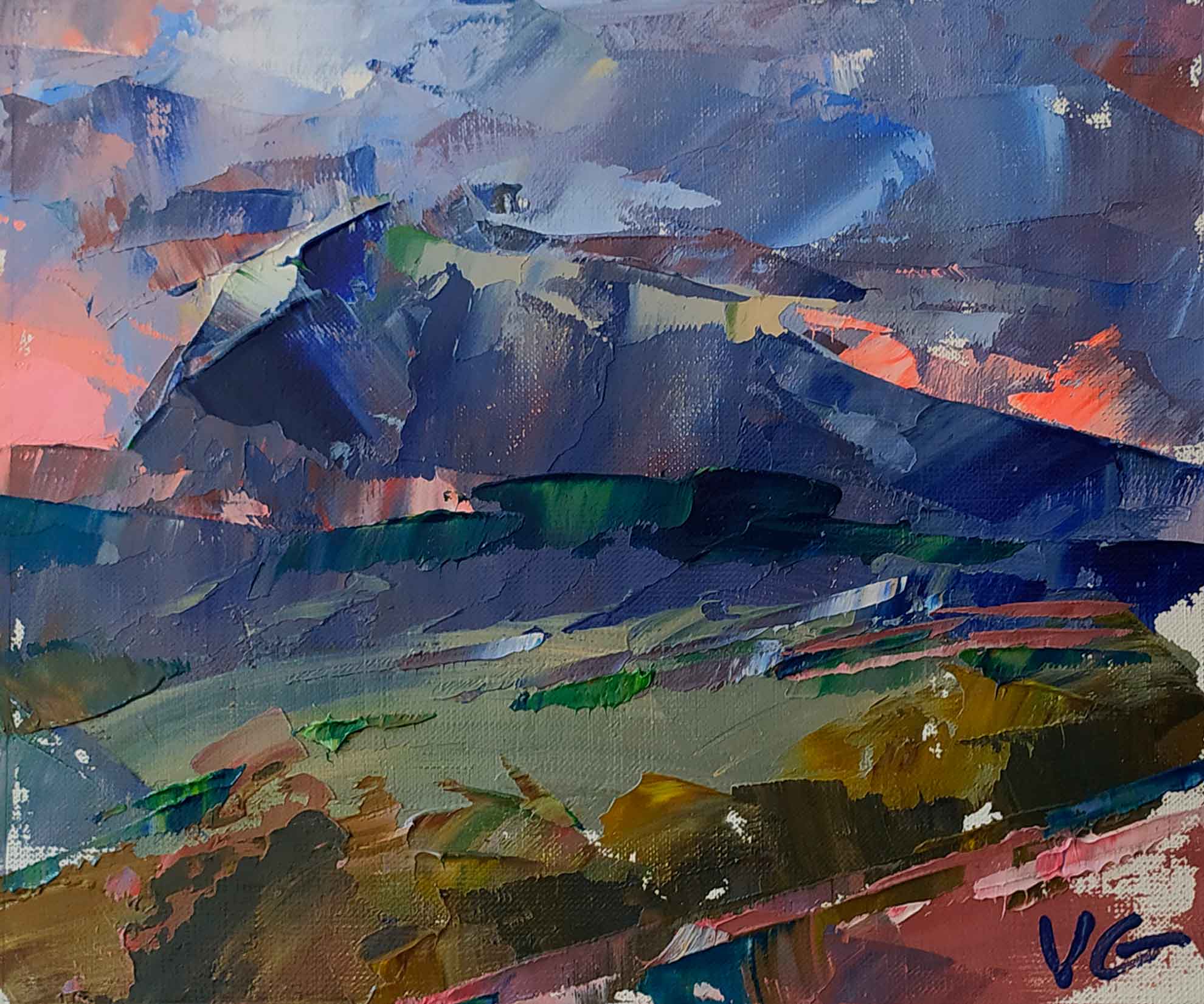 Vivid colors and bold brushstrokes bring to life a mountainous landscape under a dynamic sky. The foreground is composed of rolling hills that lead the eye towards the towering peaks.