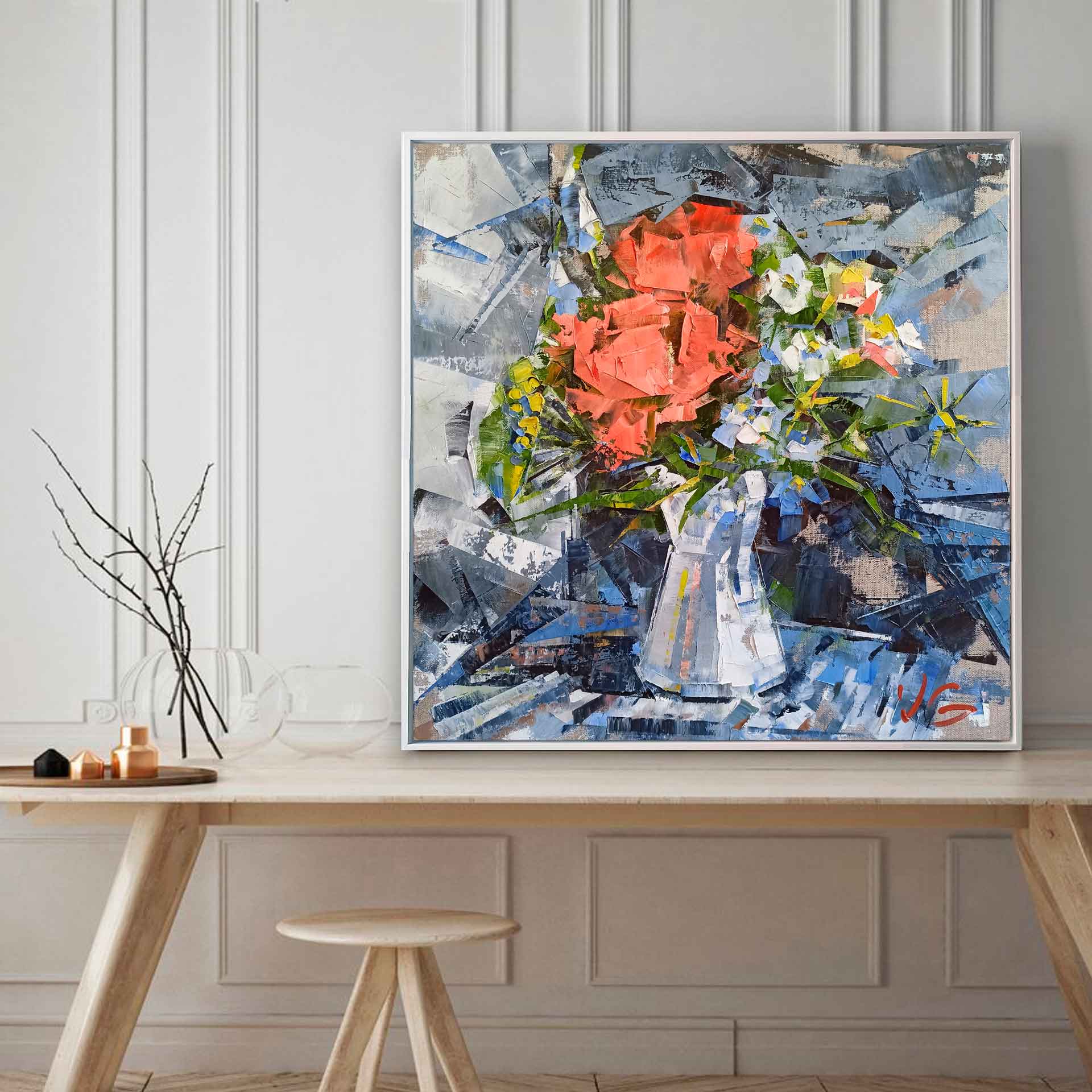 The still life is made with a palette knife, based on planes that resemble kaleidoscope crystals - hence the name KALEIDOSCOPE OF FLOWERING. The geometric cobweb, in general, is read by a single composition of the bouquet, which combines bright and active colors of wild flowers.