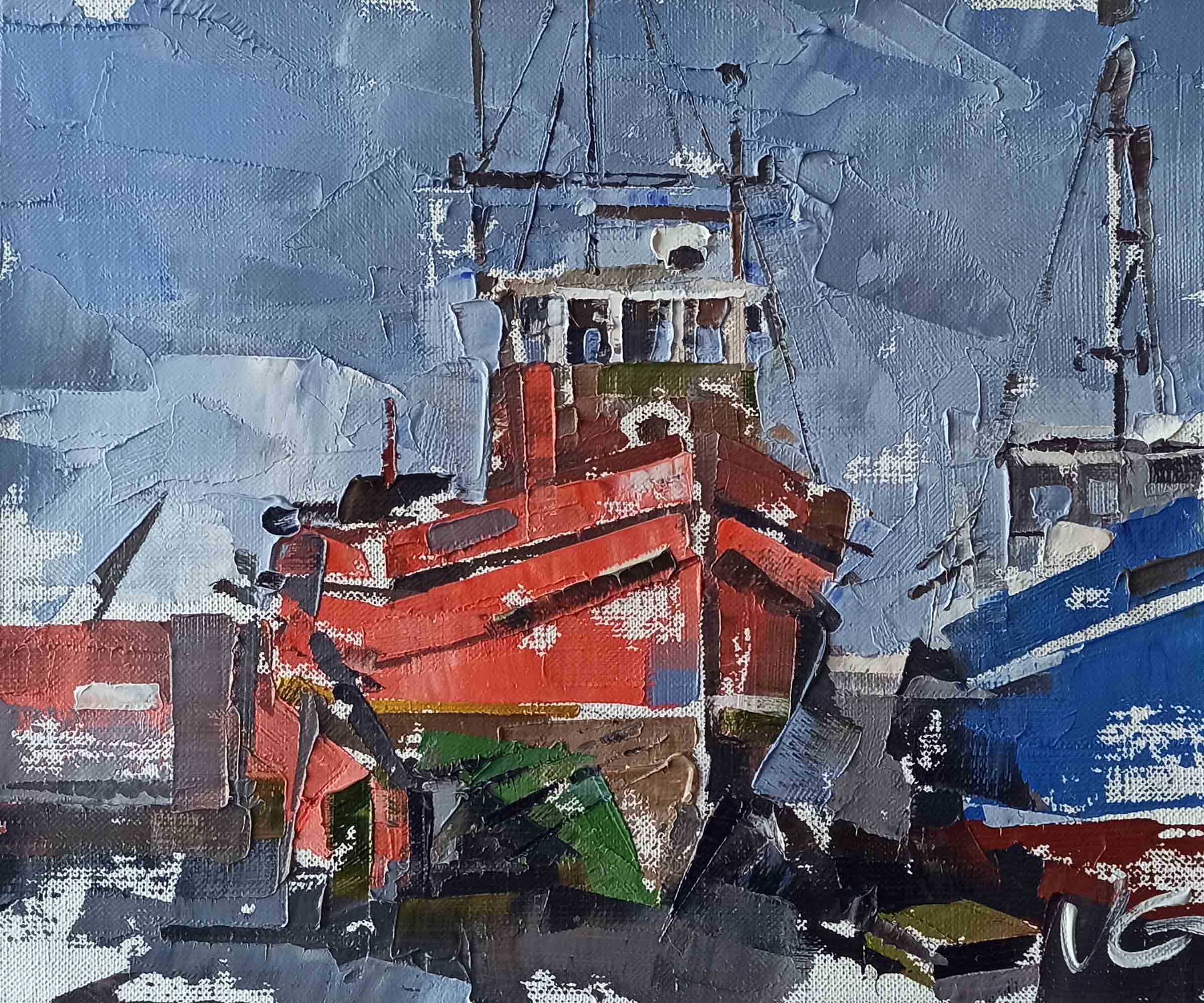 A red boat is prominently displayed in what appears to be a marina with other vessels around it. The sky and surrounding area are rendered with rough, expressive brushstrokes.