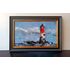 A bold red and white lighthouse stands prominently against a backdrop of choppy blue and white brushstrokes, evoking a strong maritime feel. The abstract quality of the painting suggests movement, perhaps of water or clouds, surrounding the solid structure of the lighthouse.