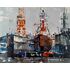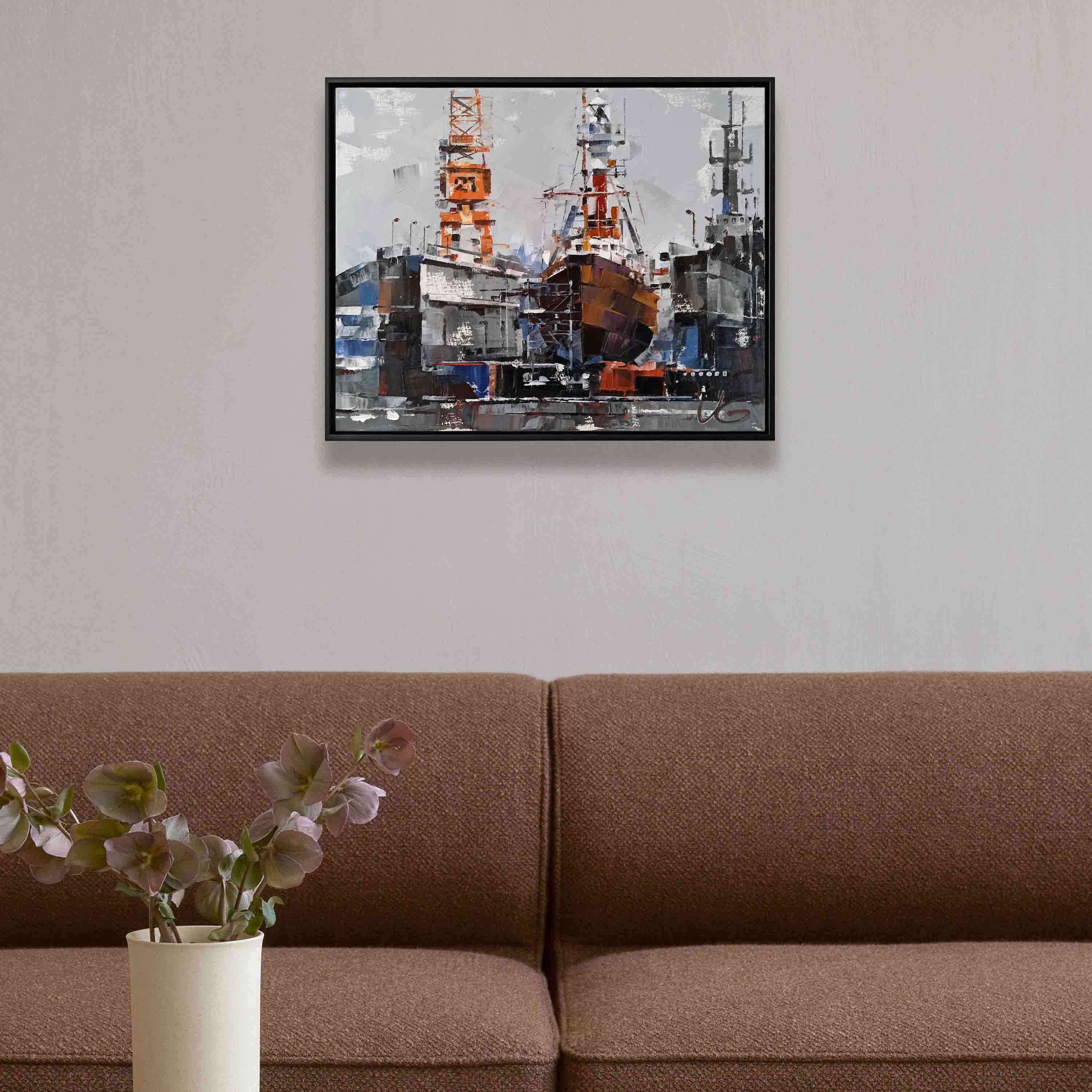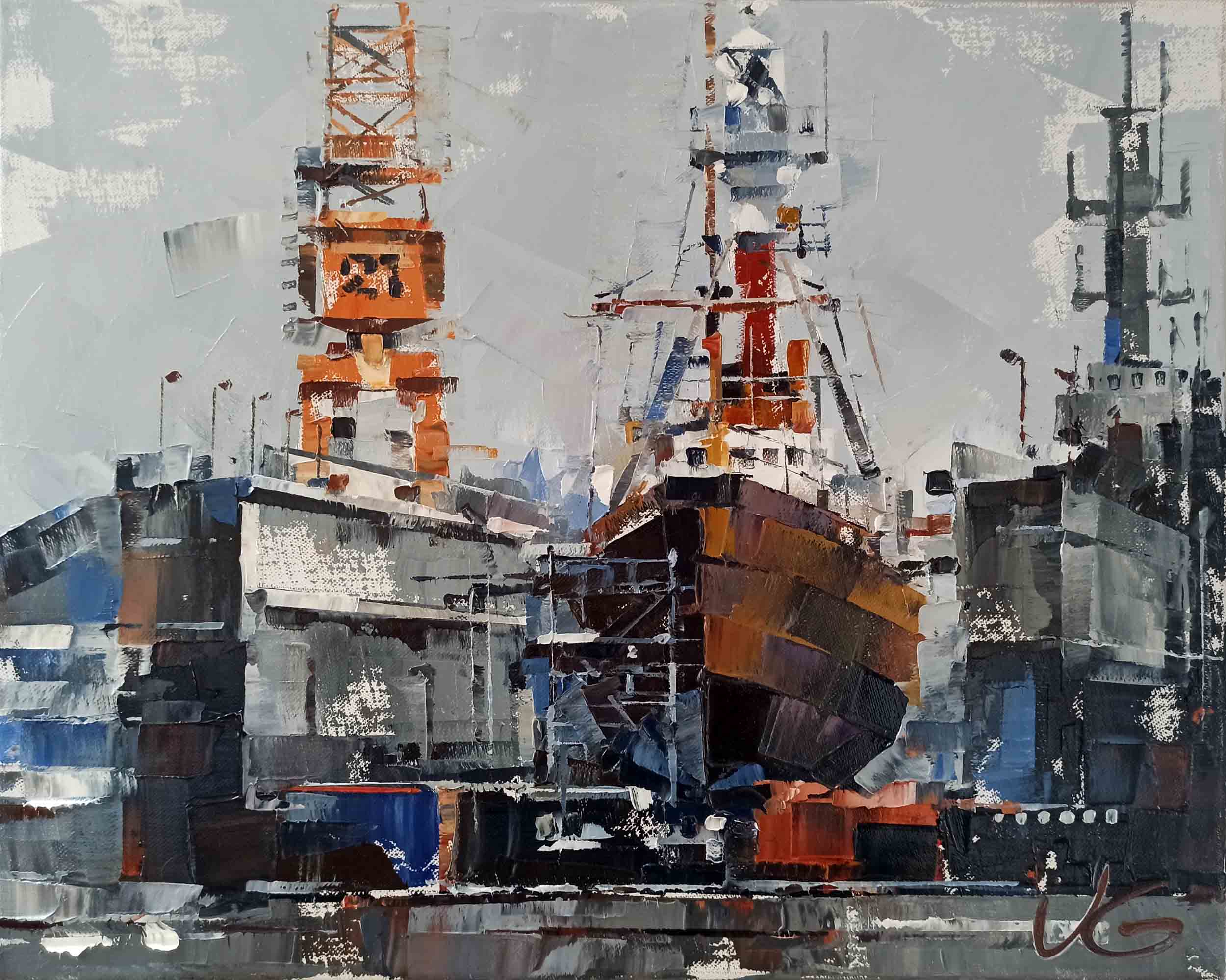 In a bustling harbor scene, ships and industrial structures are depicted with bold, expressive brushstrokes that give a sense of movement and activity. A palette of grays, whites and hints of orange and blue add vibrancy to this nautical theme, capturing the essence of maritime commerce and engineering.