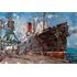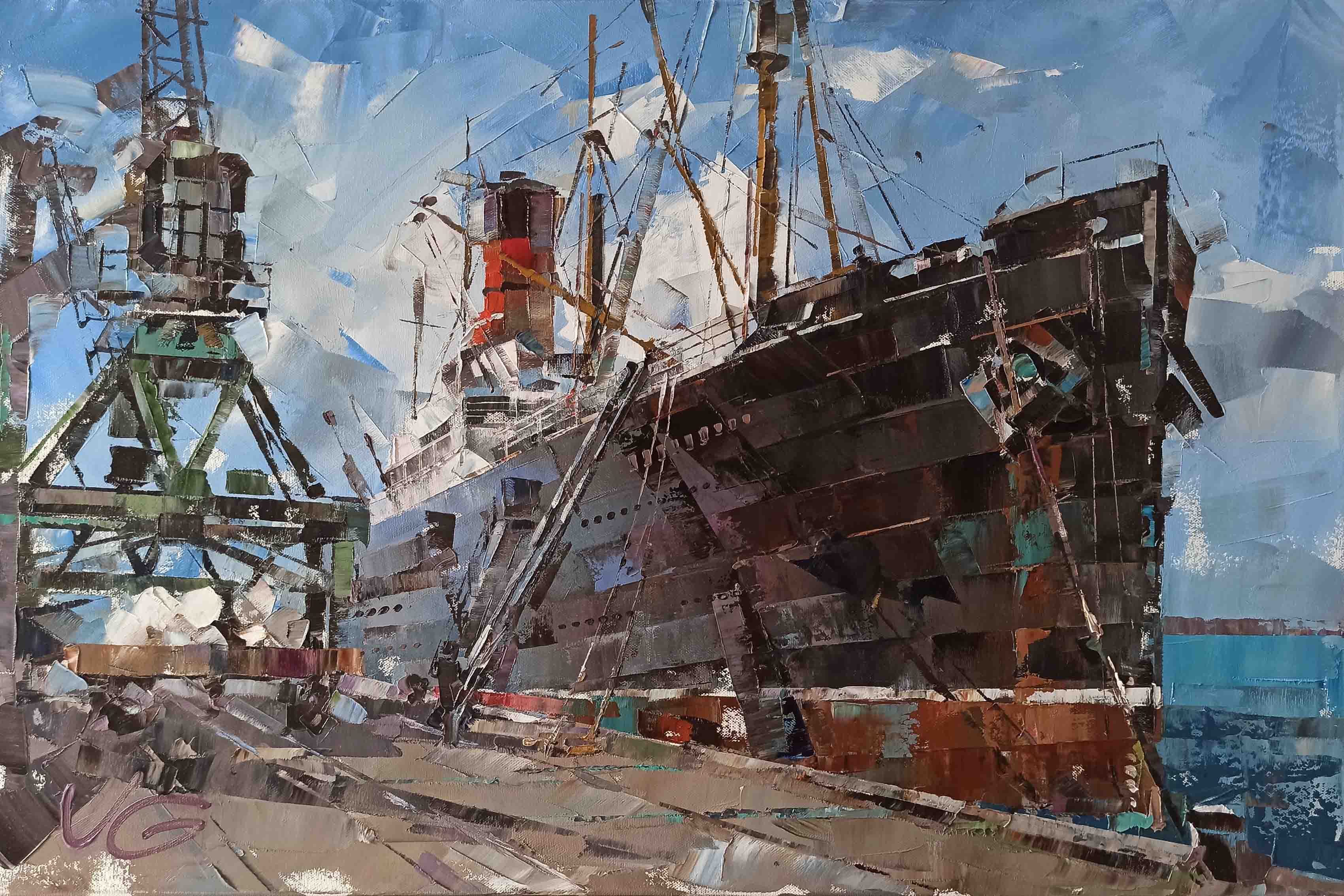 A large ship is docked at a harbor, with cranes and other machinery visible on the pier. The sky is painted a bright blue with scattered white clouds.