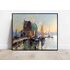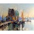 A small harbor comes alive with wooden fishing sailboats moored at a pier with port buildings, softly reflected in the calm water. The sky glows with soft pastel shades, creating a feeling of a serene late evening.