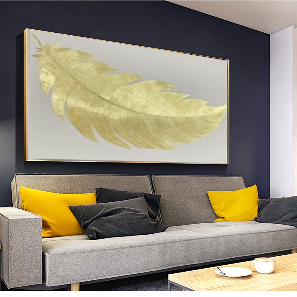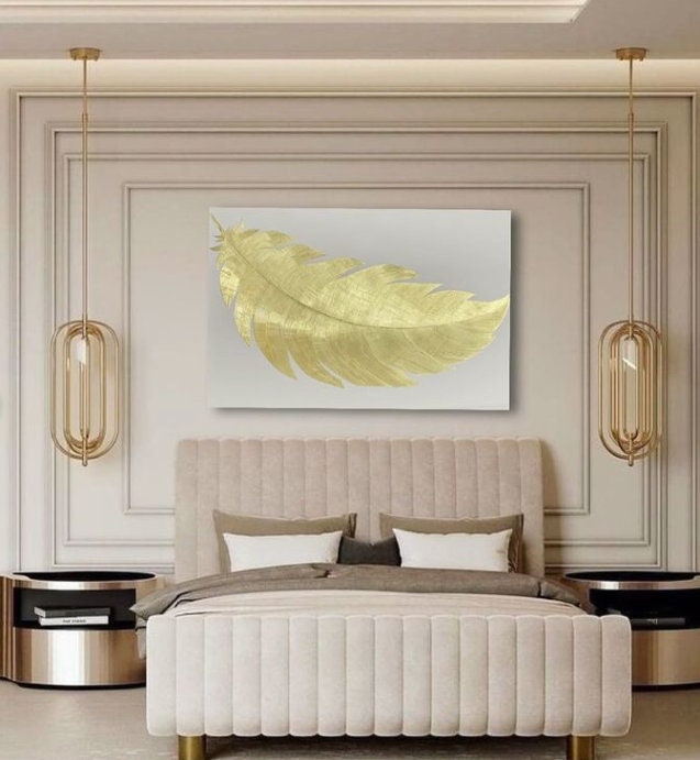Acrylic painting gold feather Gold Leaf Painting Feather Wall Decor Textured Above Bed Art Oversize Wall Art Original paintingon canvas art
