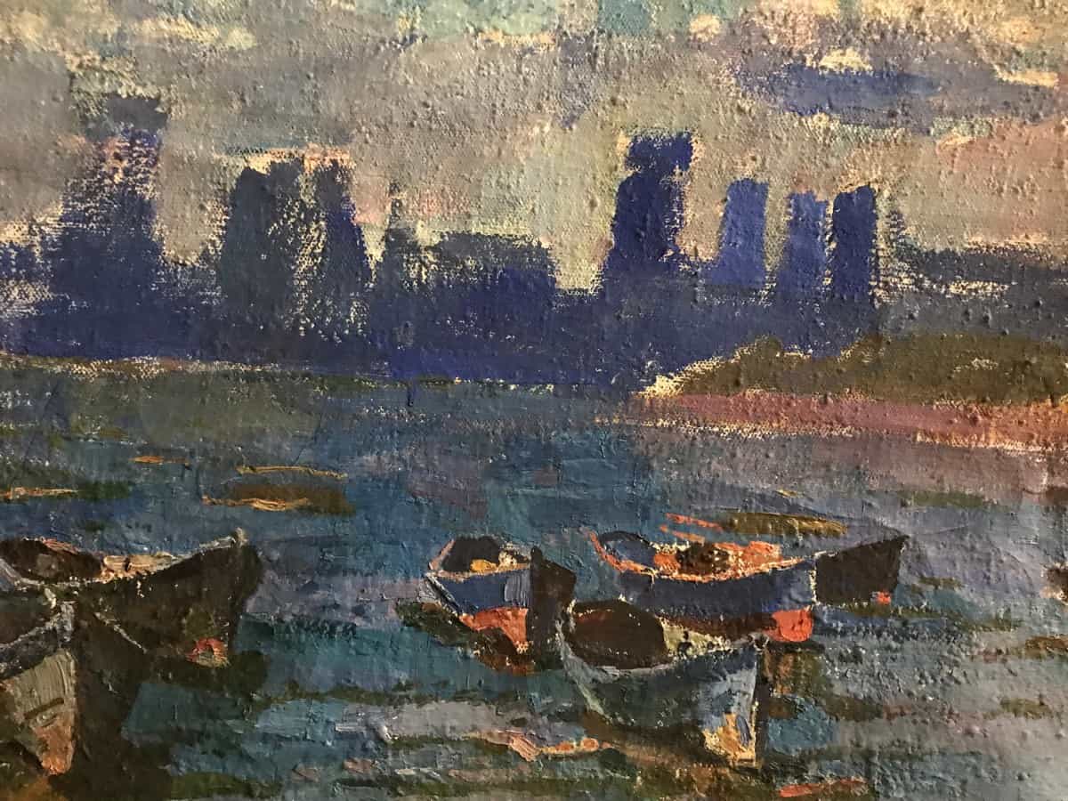 The color scheme becomes bright and varied due to the patchy spots of the boats standing on the shore. These small mottled splashes create a colorful accent. Despite the cloudy sky, the author creates a picture full of the love of life.