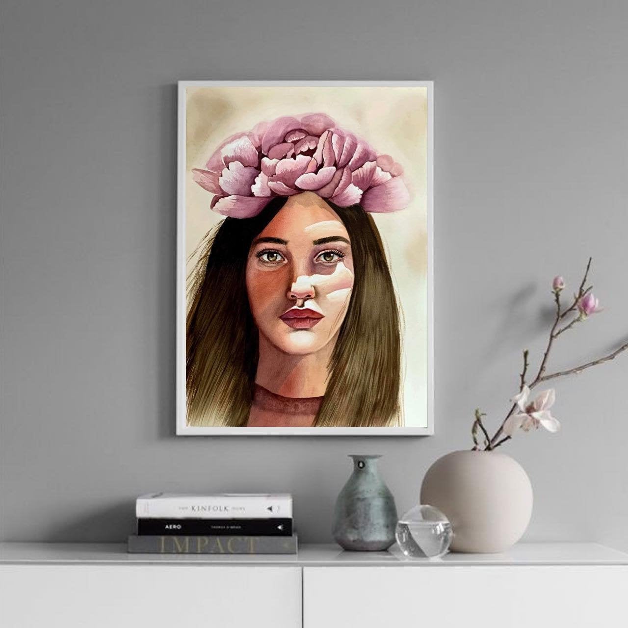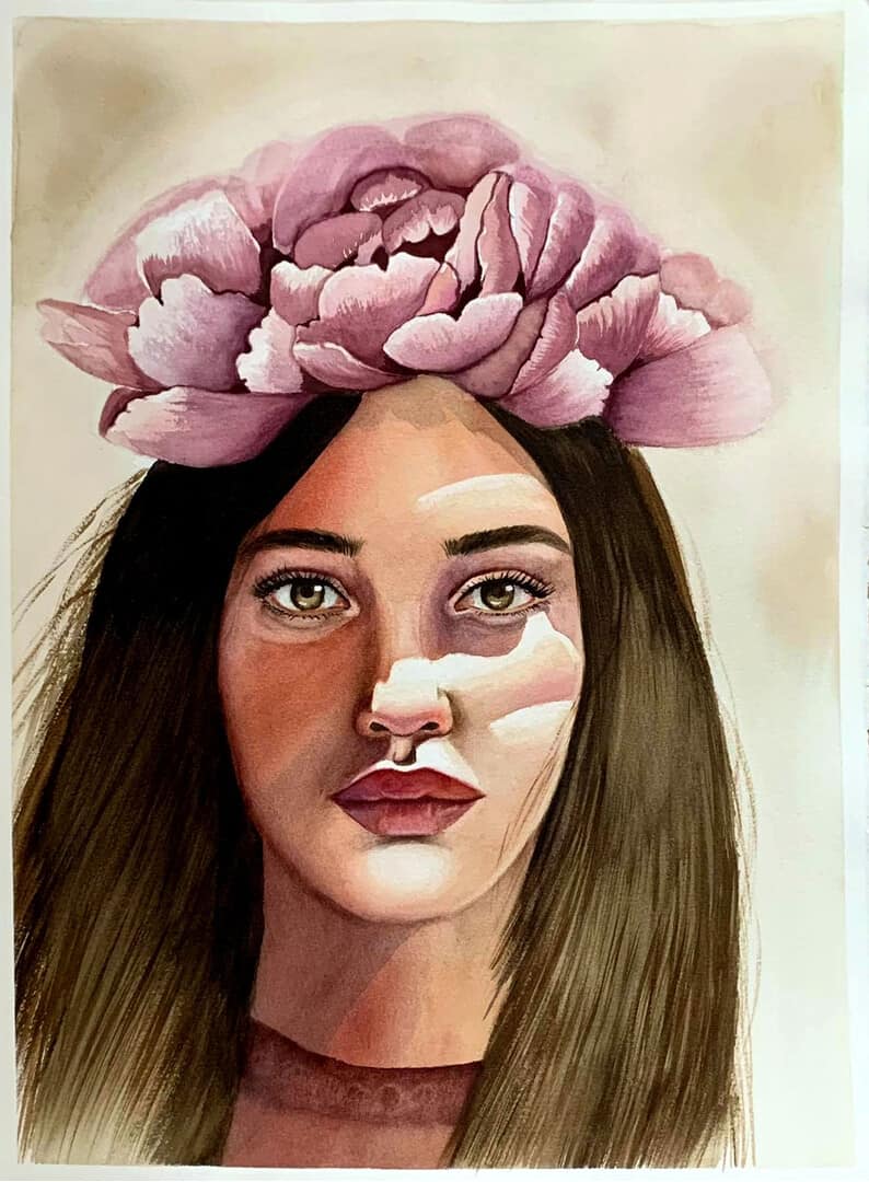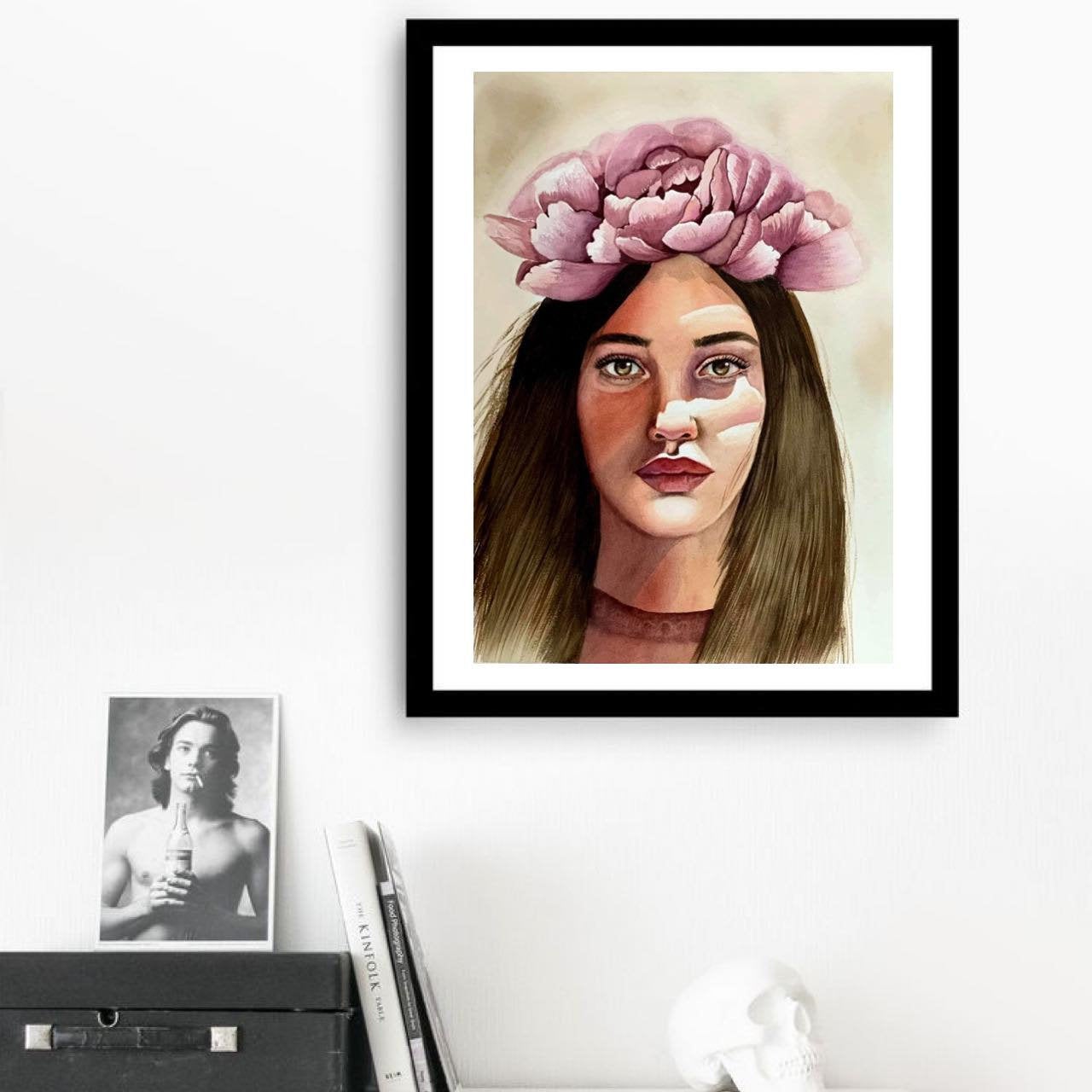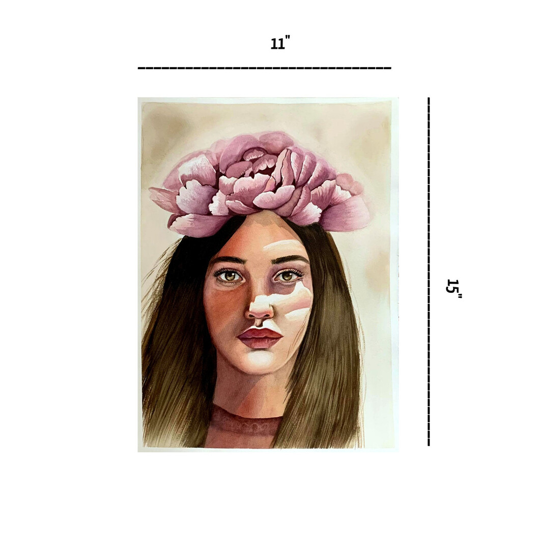 Boho Artwork Woman Face Painting Peony Painting 11" by 15"