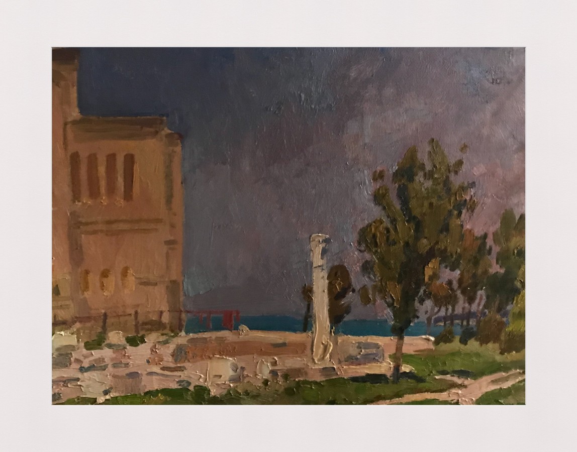The painting depicts the famous basilica ("the basilica of 1935" - according to the date of excavation) - a visiting card of Chersonesos. White columns against the blue sea - a symbol of the ancient city, captivate our eyes and imagination.