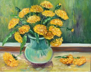 This oil painting on panel conveys the mood of a vibrant still life with flowers. It will enhance your interior and make a wonderful gift for art lovers.  * Size: 30 x 30 cm (12 x 12 inches).  * Materials: oil paints, panel, palette knife, varnish, brushes. * Need a decorative frame.  The texture can be seen in the close-up photos
