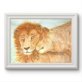 Painting "Lion tenderness of a lioness" 2019 Artist Lesia Fedorko. 100% original handmade in a single copy. This is a watercolor painting of two lions. The lioness is gently cuddling the lion, showing the warmth and closeness between them. The male has a thick mane, and his expression is calm and reserved. The background is light, with blue which adds lightness and softness to the composition. The painting conveys a sense of harmony, love, and trust between the animals. Dimensions: 16.5x11.7 inches (42x30cm) Materials: watercolor, paper A decorative frame is required. The color palette is very gentle and pleasing to the eye. Please note that the colors in the images may vary depending on your monitor settings! Such a painting will be a great addition to any home or office. It is also a great birthday gift for anyone. All paintings are packed in gift paper. The painting is signed by the artist.