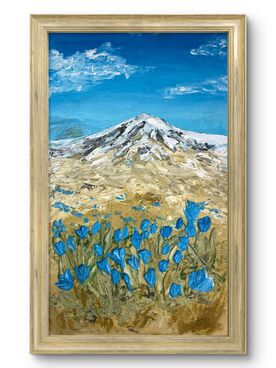 Painting "Mountains and the first flowers" . 2019 Artist Lesia Fedorko. 100% original handmade in a single copy. Dimensions: 16x10 inches (42x25 cm) Materials: acrylic, panel In the foreground are bright blue flowers. In the background is a snow-capped mountain range under a clear blue sky with light white clouds. The painting conveys a sense of natural harmony and tranquility, combining warm and cool colors.  Relief drawing. Textured paste. Impasto technique. Flowers are convex. Will be a wonderful gift. You can order a painting for yourself, as a gift for him, a portrait as a gift for her. Delight your friend, family member or yourself. The painting is the best decoration for your home. A decorative frame is required. The color palette is very gentle and pleasing to the eye. Please note that the colors in the images may vary depending on your monitor settings! This painting will be a great addition to any home or office. It is also a great birthday gift for anyone. All paintings are wrapped in gift paper. The painting is signed by the artist.