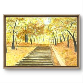 Painting "Stairs up in the autumn park". 2019 Artist Lesia Fedorko. 100% original handmade in a single copy. This painting depicts an autumn forest with a path leading up the stairs. The trees are dressed in golden yellow and orange shades, which creates a warm and cozy atmosphere. The light breaks through the branches, adding a soft glow to the image. In the foreground, wooden stairs and a handrail on the right side are visible, leading into the depths of the forest. The composition conveys a calm mood and calls for a walk in the autumn park. Dimensions: 16.5x11.7 inches (42x30cm) Materials: watercolor, paper A decorative frame is required. The color palette is very gentle and pleasing to the eye. Please note that the colors in the images may vary depending on your monitor settings! Such a painting will be a great addition to any home or office. It is also a great birthday gift for anyone. All paintings are wrapped in gift paper. The painting is signed by the artist.