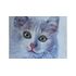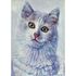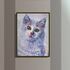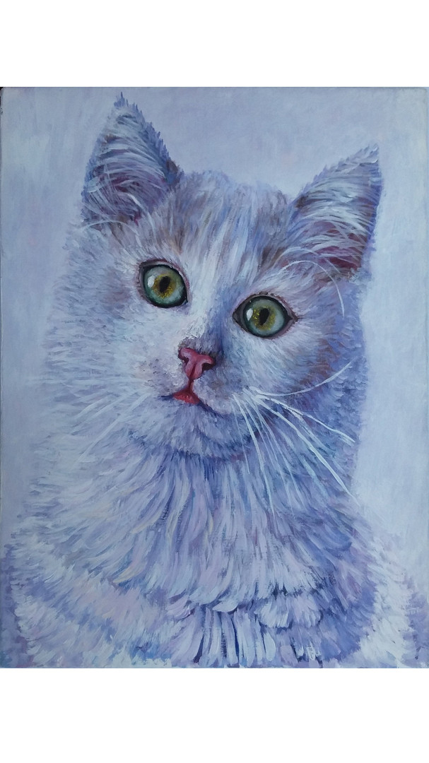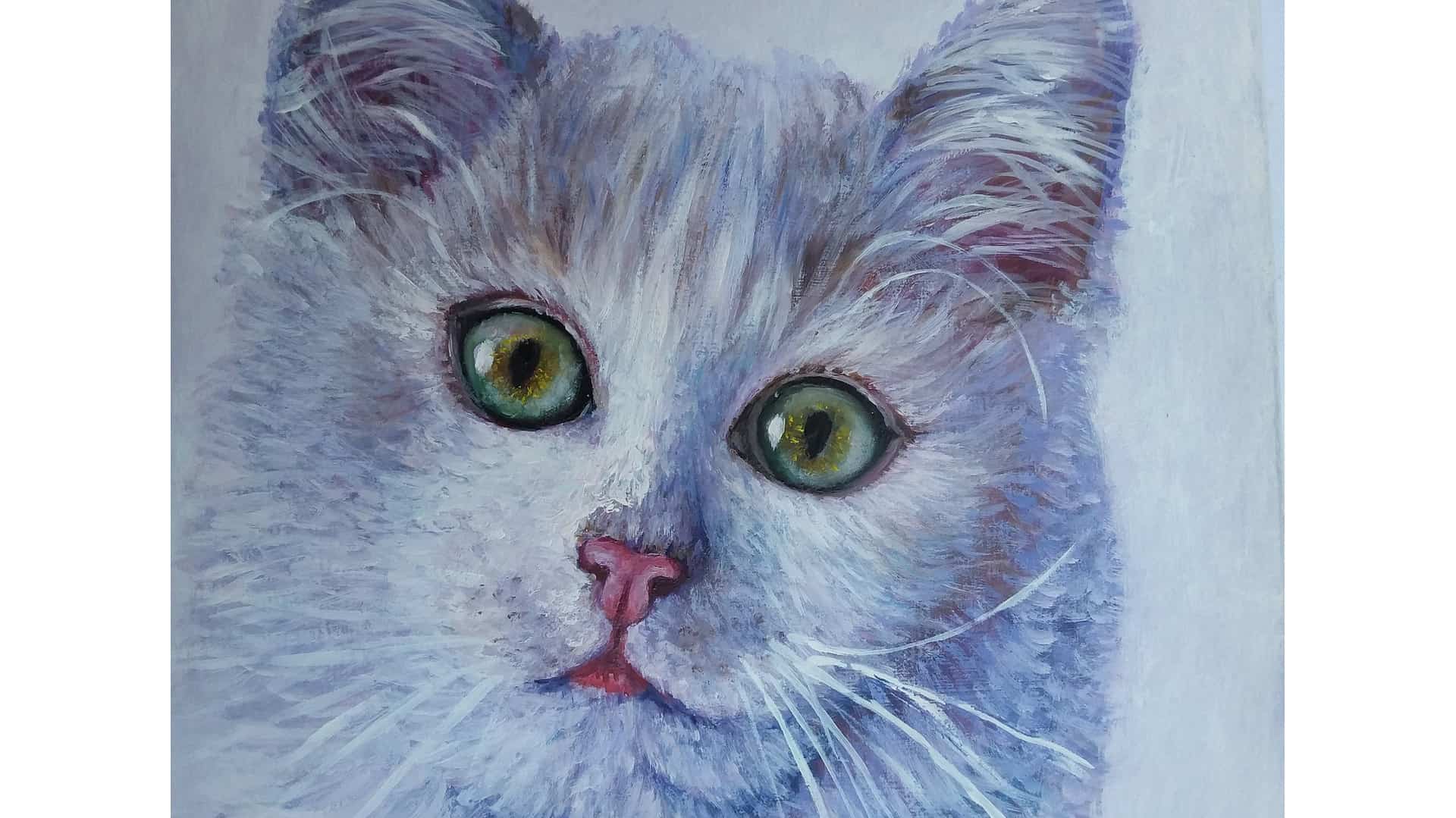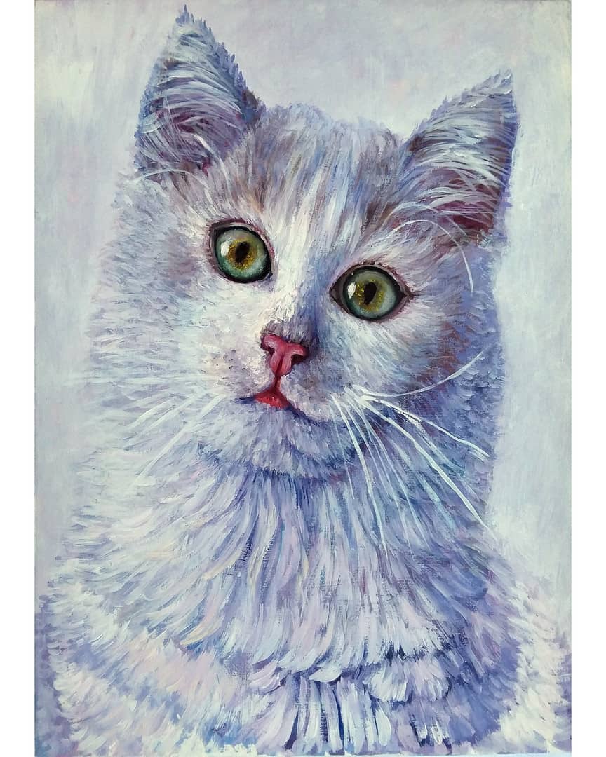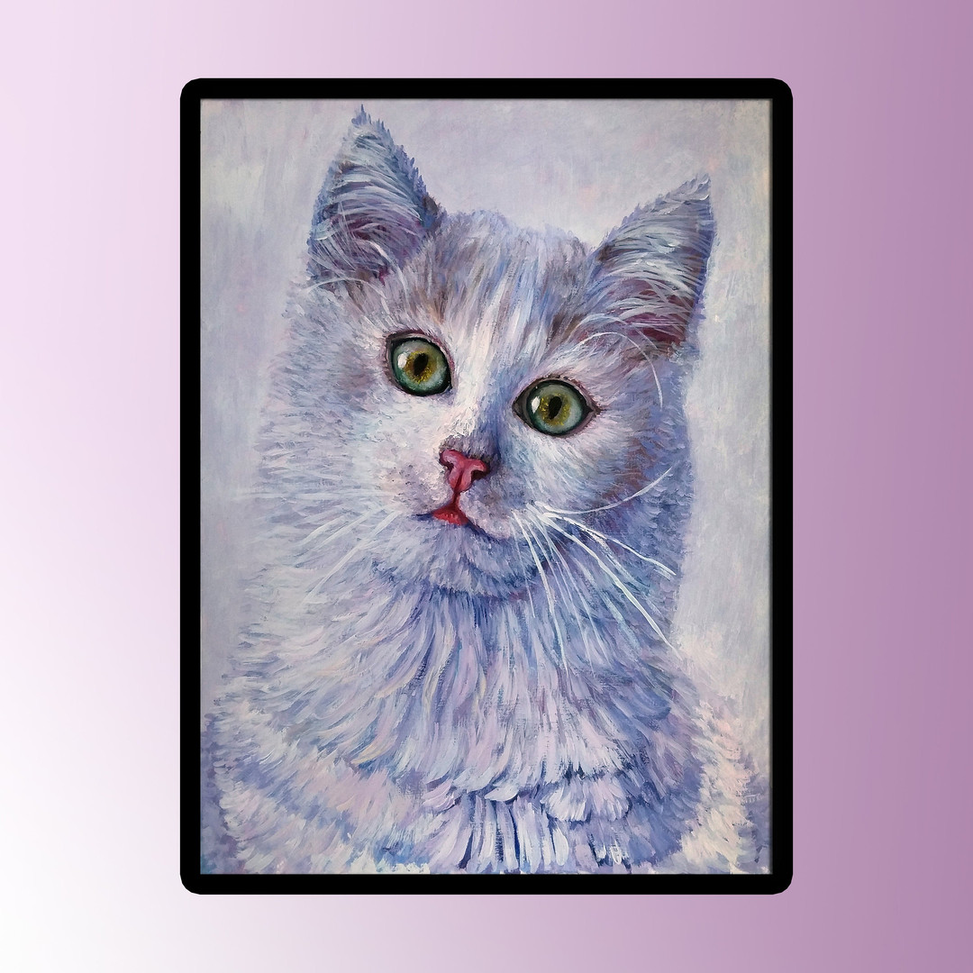 The white cat on a white background is painted in violet-blue tones on a cotton canvas stretched over a stretcher.