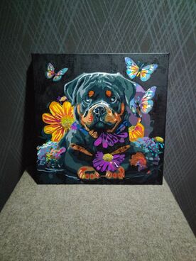 "Charming Rottweiler Watercolor Wall Art on Black Canvas - Perfect Gift for Dog Lovers and Pet Owners" "Beautiful Rottweiler Wall Decor - Watercolor Painting for Dog Memory - Unique Gift for Beloved Pet" I painted this exotic painting from the Coloring by Numbers set with acrylic paints. The painting turned out bright, unusual, mysterious. Depending on the background of the wall and time of day it changes its shades and saturation. I hope you will like it and find a worthy place in your interior. This painting consists of a linen canvas in black color, fixed on a wooden frame. Enclosed are wall mounts. size 16 “x16”/40x40cm The color and saturation in the photo may vary slightly from the work as it is affected by different monitor settings or your phone. Within 1-3 business days, your artwork will be carefully packed and sent. Transit time for orders worldwide is from 7 to 35 days. If you have any questions, email me any clarifications before you make and pay for the order. Make your decision wisely, I always come to the aid, if it depends on me. For any questions, write me a private message. Due to the peculiarities of customs in different countries, the parcel may take longer than usual. Additional goods upon delivery are considered to be goods from a similar category. When combining parcels, oversized goods are paid at the higher cost of the selected item; I will first combine, coordinate and give you the full shipping cost. I always try to keep it to a minimum. Thanks for understanding. Please enter your valid contact number and email address when ordering, because in this contact form you may be contacted by your country's customs department to deliver your order. If they can't contact you, they will send the package back. And in such a situation, the responsibility will lie with the Buyer.