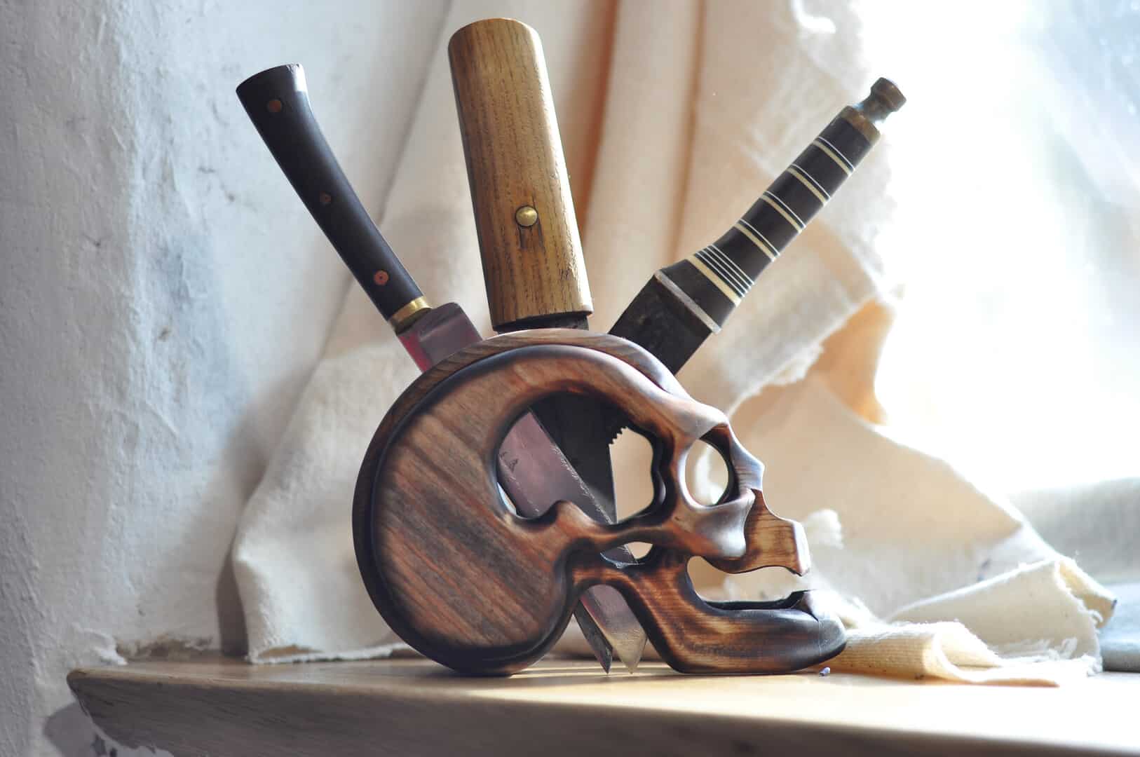 Handmade wood sculpture skull stand for 5 knafes for Stephanie