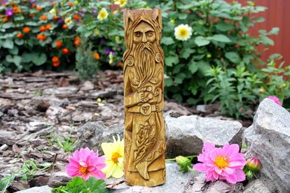 This is hand carved wooden small figurines of the Celtic gods - Cernunnos (Horned God), Dian Cecht and Angus. They are made of linden tree and are covered with linseed oil and wax. All figurines are approximately 15 centimeters (6 Inches) tall. You can choose the desired figurine in the drop-down menu. CERNUNNOS is a horned god found in Celtic mythology. He is connected with male animals, particularly the stag in rut, and this has led him to be associated with fertility and vegetation.With his mighty antlers, Cernunnos is a protector of the forest and master of the hunt. He is a god of vegetation and trees in his aspect as the Green Man, and a god of lust and fertility when connected with Pan, the Greek satyr. In some traditions, he is seen as a god of death and dying, and takes the time to comfort the dead by singing to them on their way to the spirit world. ANGUS is the love God of Irish mythology.He was a very handsome young man of fine physcial proportions and an attractive nature. He was circled at all times by four small birds, said to symbolize his kisses and he could woo any maiden he set his mind too, or invoke love among others. DIAN CECHT, one of the Tuatha Dé Danann, the gods of Celtic Ireland.He was the physician of the gods.Dian Cécht claimed to be able to restore any man who was mortally wounded. He did this by throwing the wounded into a well and pulling them out alive. This may refer to Celtic ritual involving ritual bathing or drowning. Only a single copy! I can make figurines of other gods on an individual order.