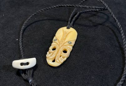 This one-of-a-kind pendant is carefully handcrafted in the traditional Maori style, featuring a beautiful abalone (Haliotis) shell inlay. Size: about 2 1/2" × 1 1/4" × 1/2" (6 × 3 × 1 cm) The pendant comes on a sturdy rope cord with a hand-carved bead (see photos). Shipping notice: From Ukraine to Europe & USA, delivery usually takes about 2–3 weeks.