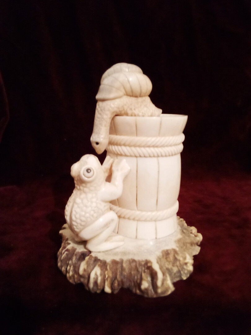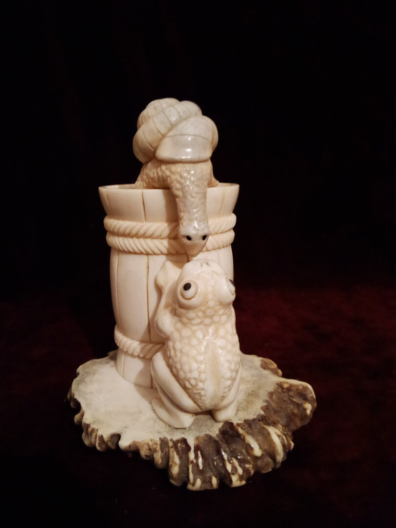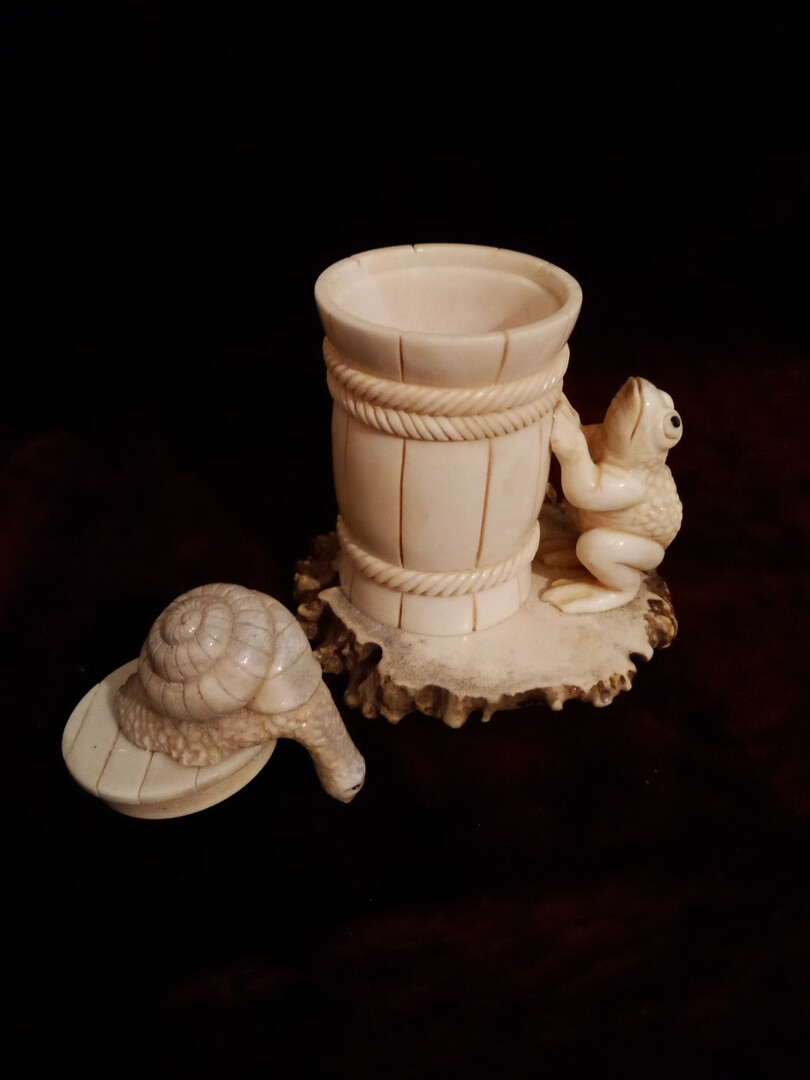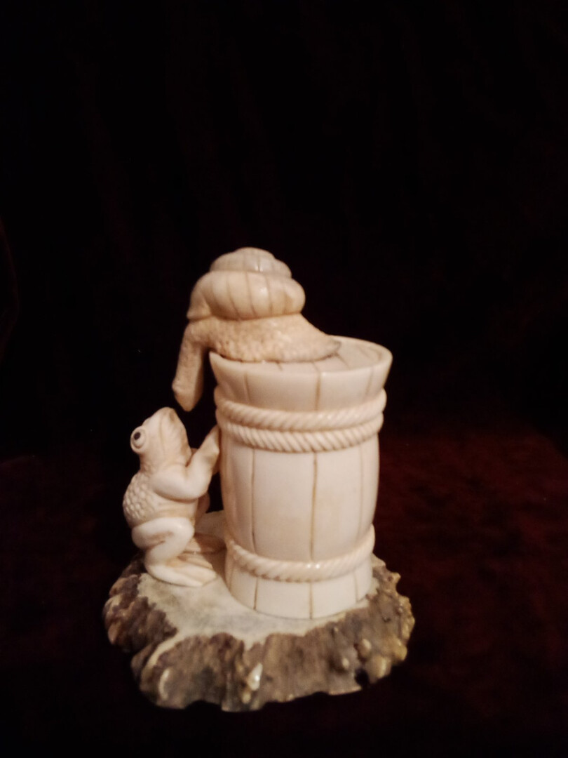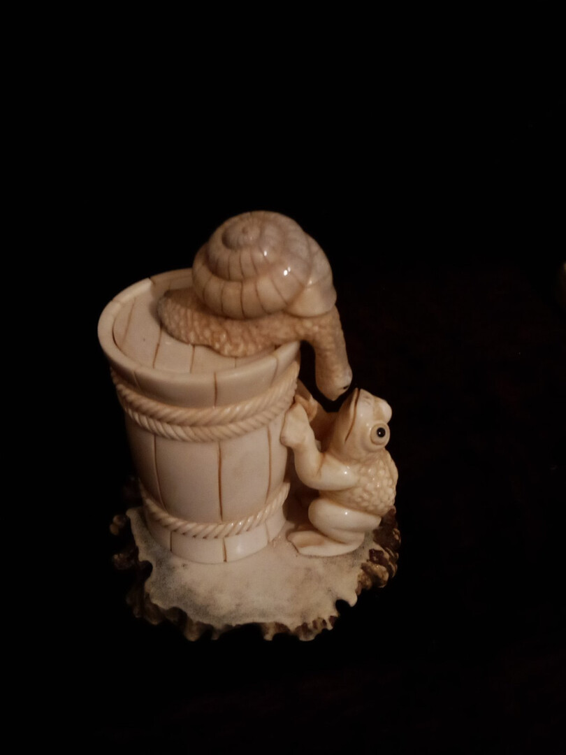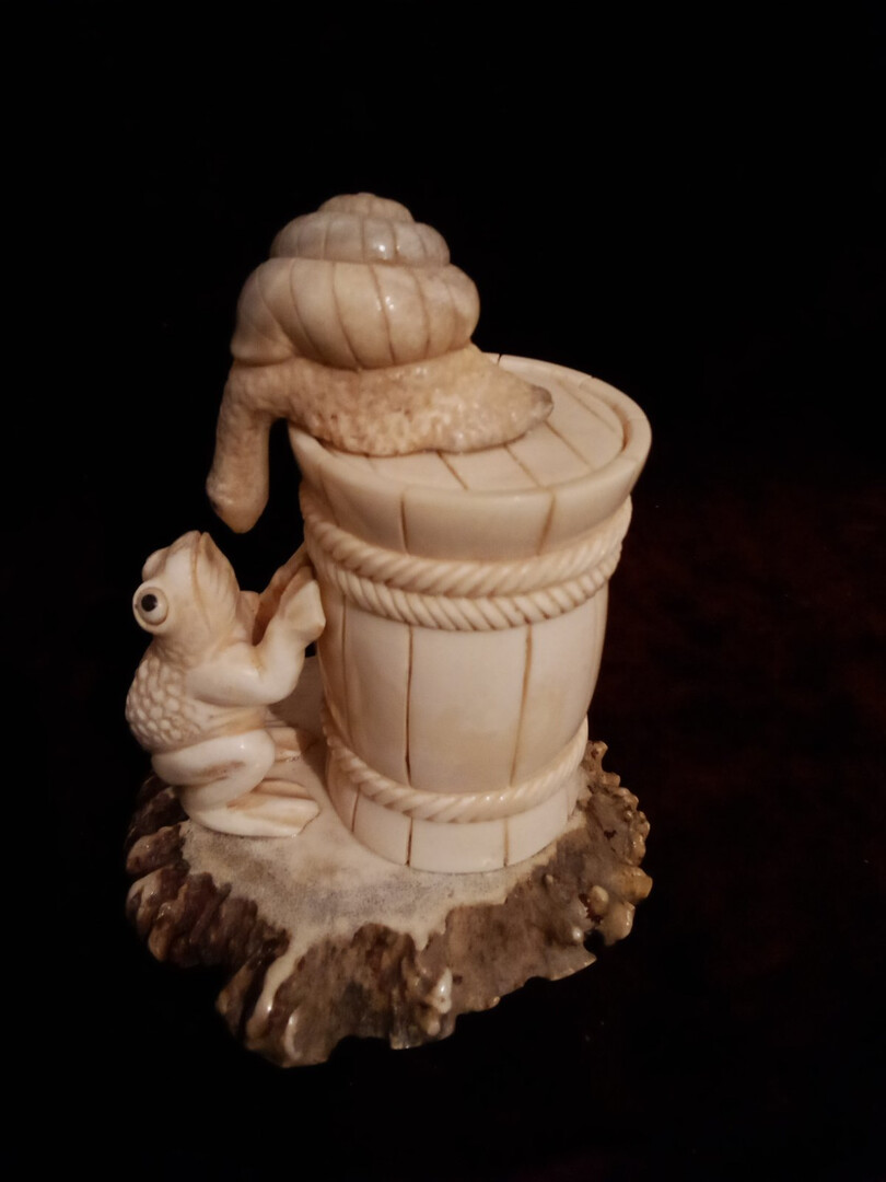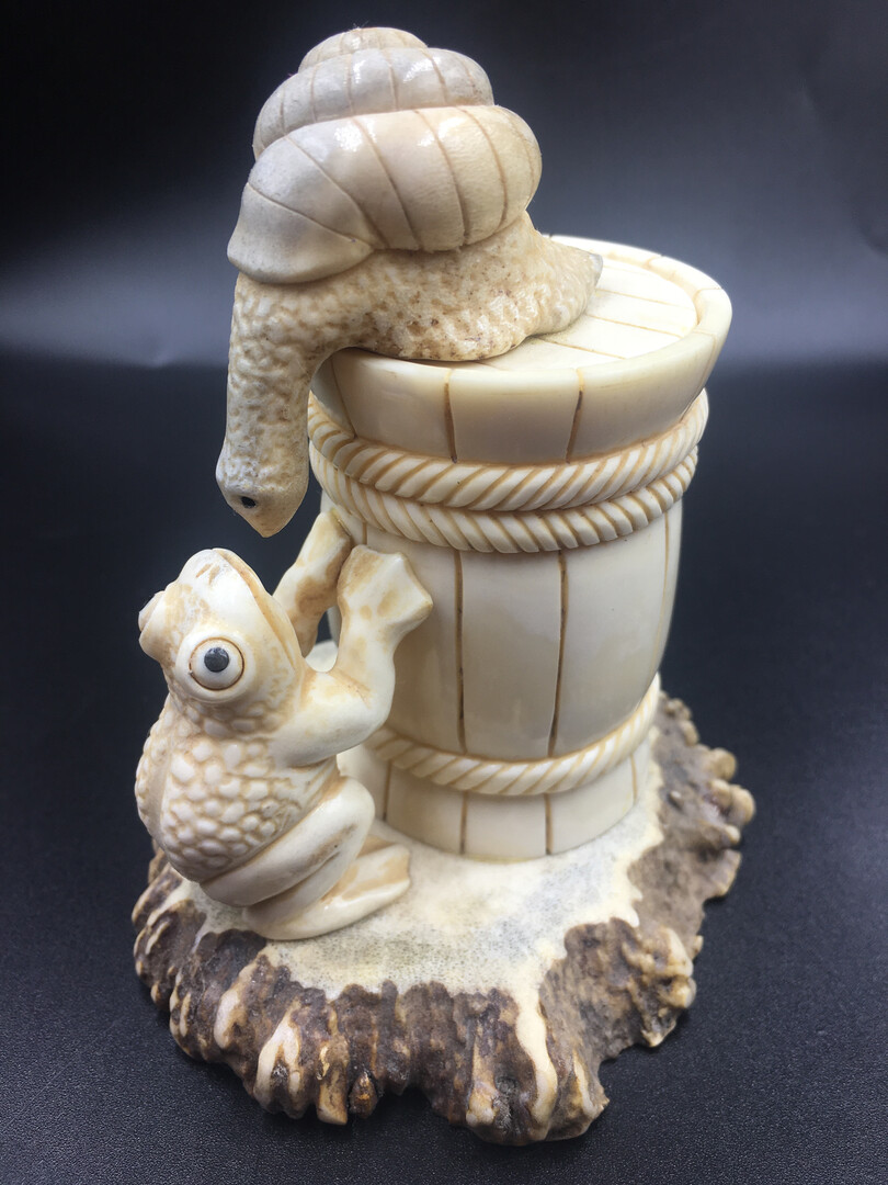 Let me introduce you Bone Carved Jewelry Casket Box, Trinket Box, Snail and Toad, Bone Art, Bone Carving, Folk Epic, 11 x 9 x 9 cm.