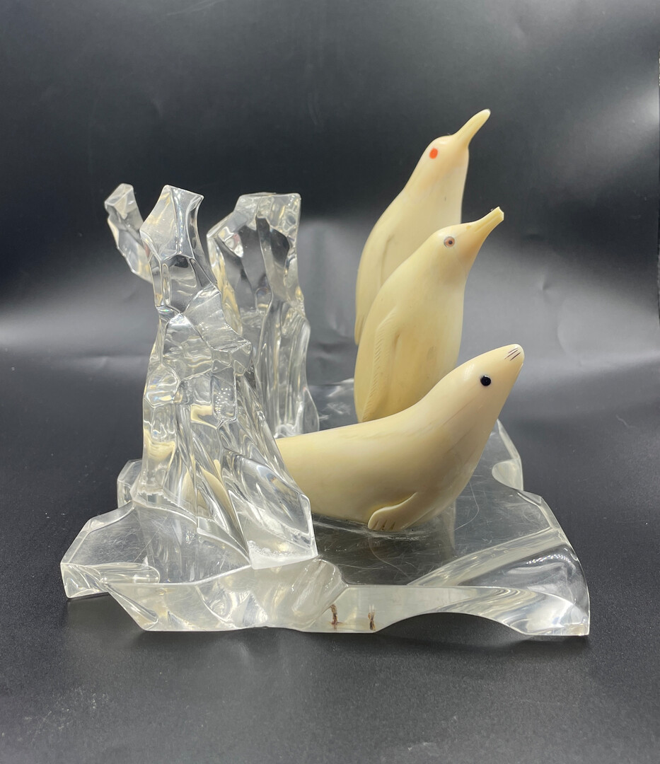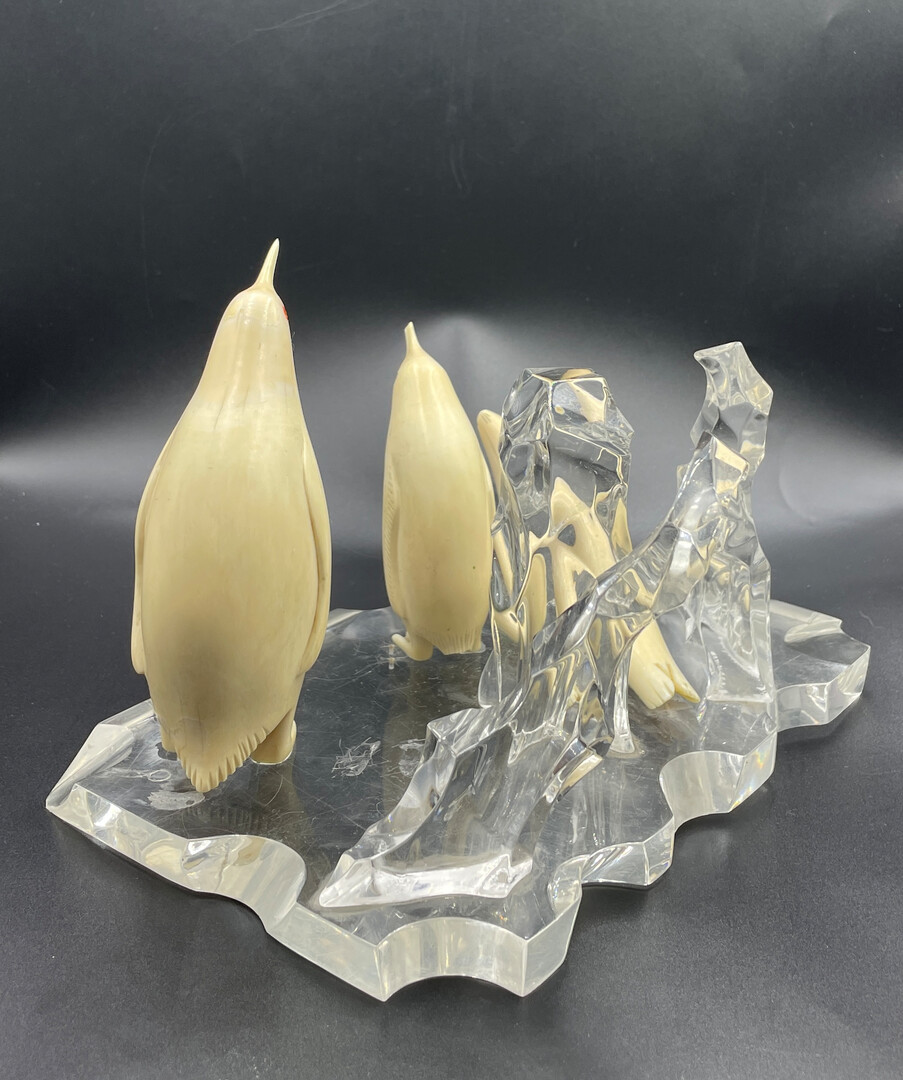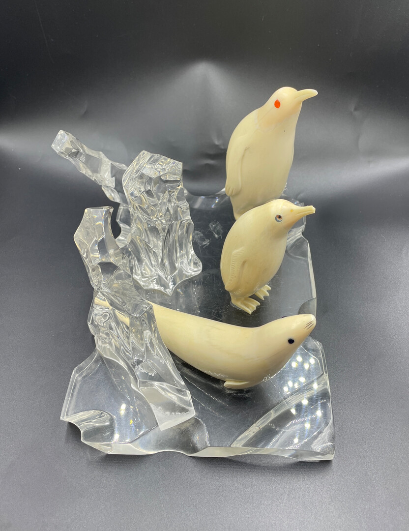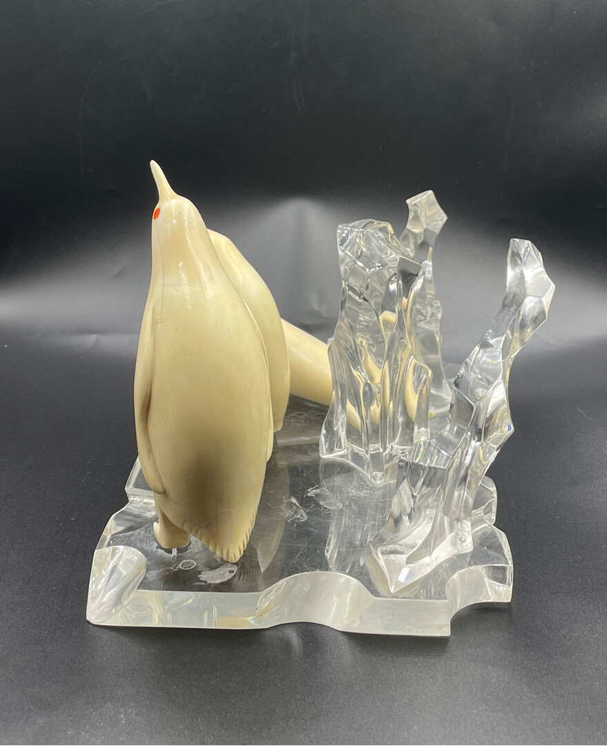 Let me introduce to your attention the Inuit Handmade Carved Figurine, Penguin Sculptures on Pedestal like Ice (organic glass), 15 * 15 * 22 cm (6" * 6" * 8.8"), 1130 g. The composition is in a good vintage condition, without restoration.