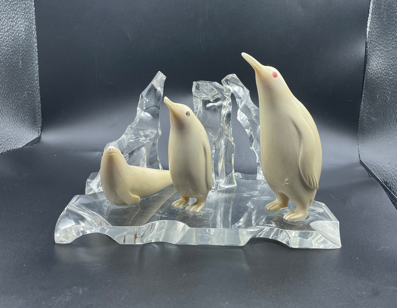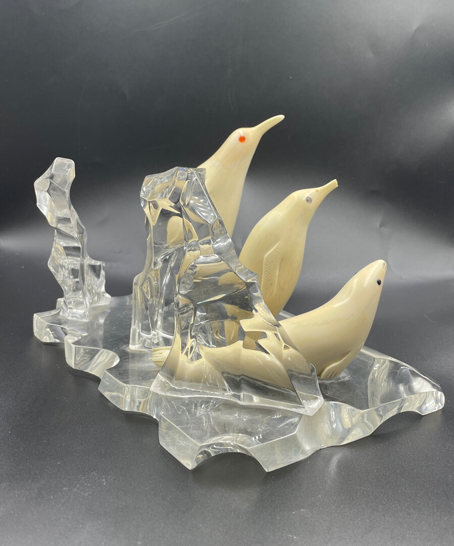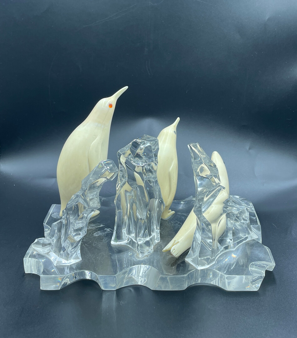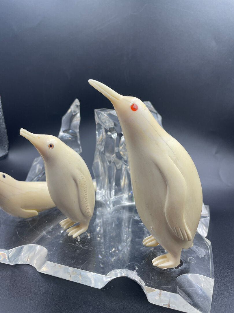 Let me introduce to your attention the Inuit Handmade Carved Figurine, Penguin Sculptures on Pedestal like Ice (organic glass), 15 * 15 * 22 cm (6" * 6" * 8.8"), 1130 g. The composition is in a good vintage condition, without restoration.
