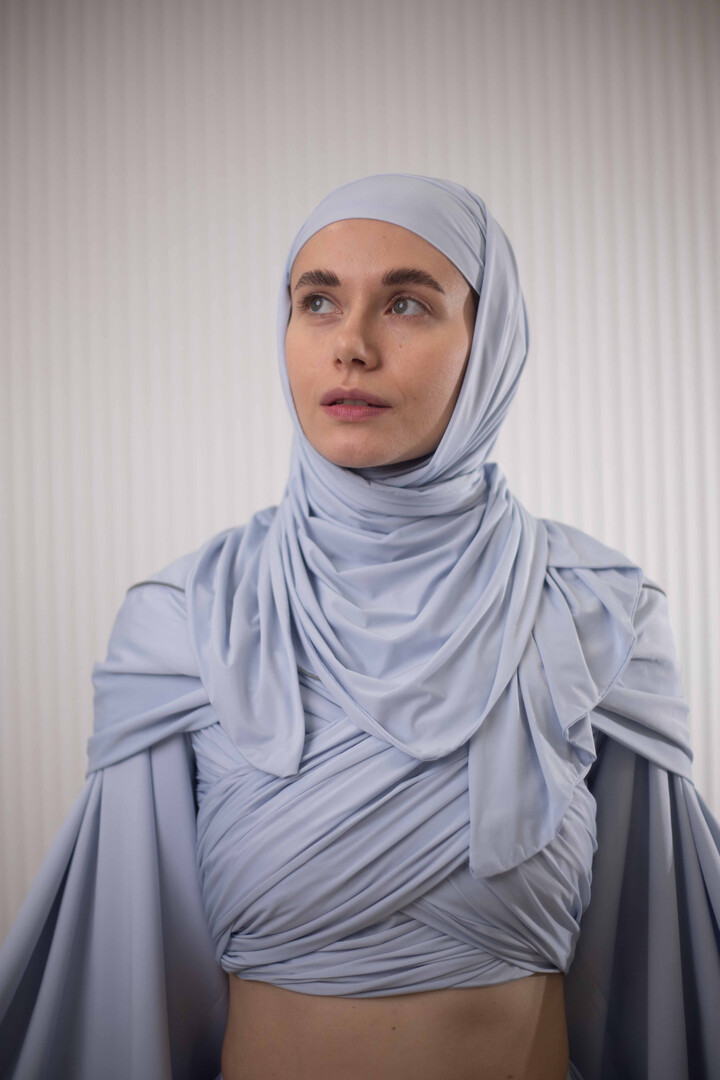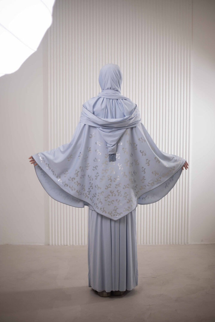 • Cape (knitted fabric decorated with thermal film like small silver metallic leafs and with narrow silver cord)