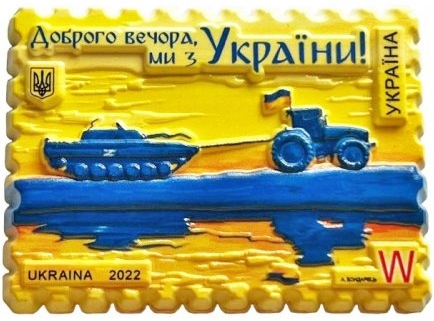 On the postage stamp "Good evening we are from Ukraine!" the real events that took place in the Mykolaiv region are recreated: a Ukrainian tractor pulls an abandoned Russian tank. According to the author of the sketch, Anastasia Bondarets, her drawing is about how every Ukrainian does everything that depends on him, by virtue of his capabilities, to bring our Victory closer.