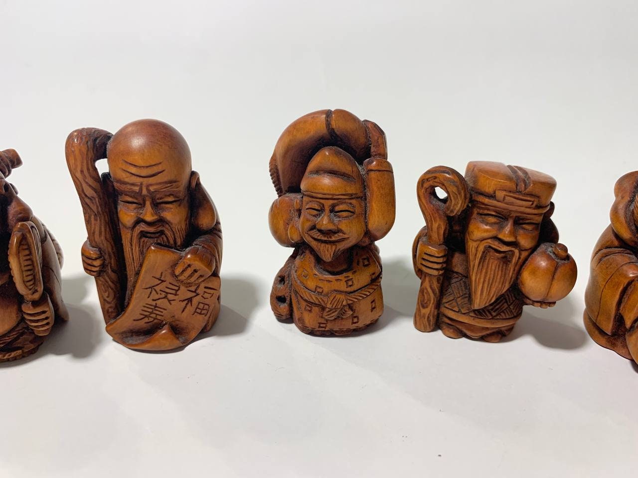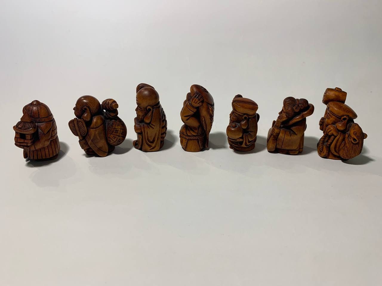 Unique Netsuke, 7 japanese gods of happiness, Seven Boxwood Netsuke, Biishamonten, Hotei, Fukurokuju, Ebisu, Dzyurodzin, Benzaiten, Daikoku