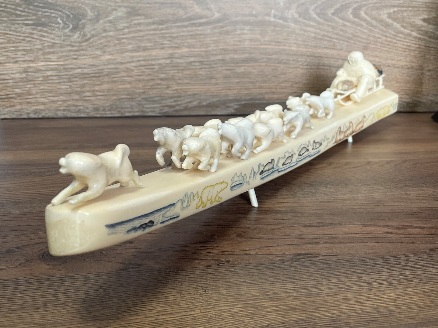 Presenting a rare and exclusive big vintage Inuit handcrafted composition from Chukotka, Bering Strait - Dog Sled in Race. This beautifully carved scene is mounted on a pedestal and represents the artistry and cultural heritage of northern Indigenous traditions.