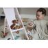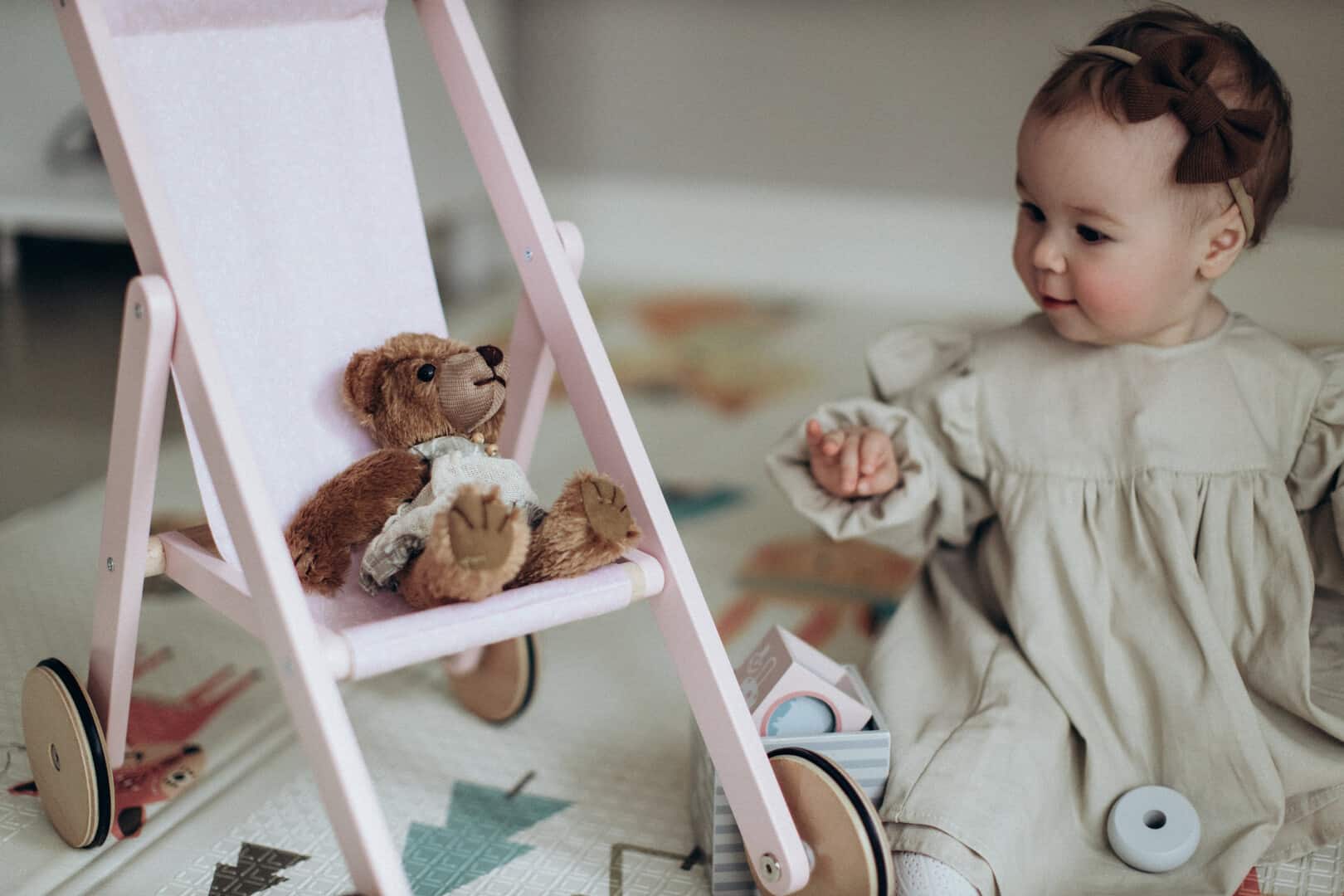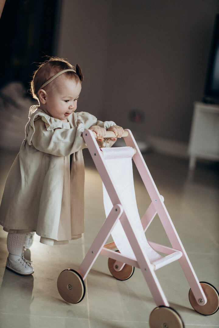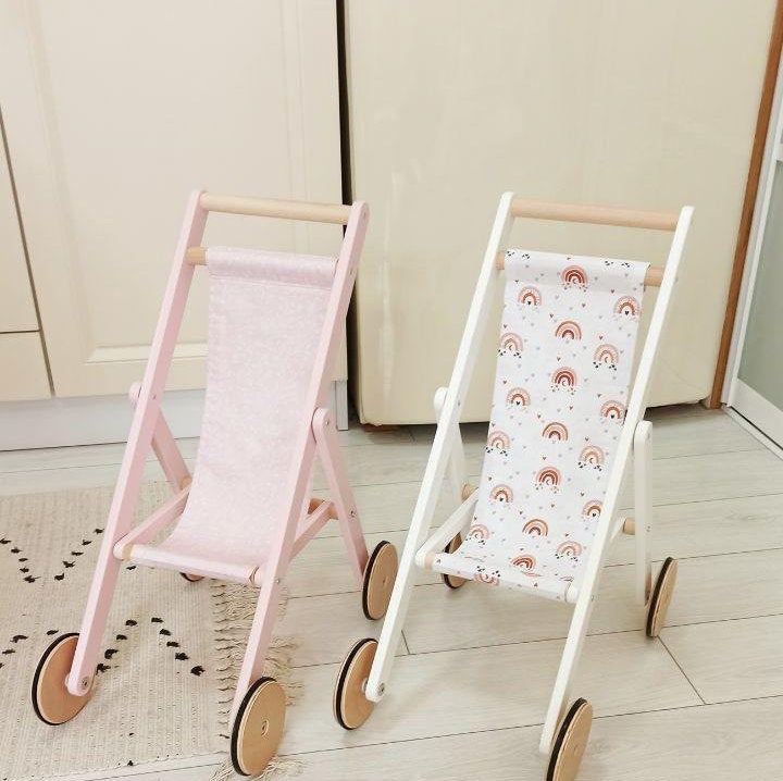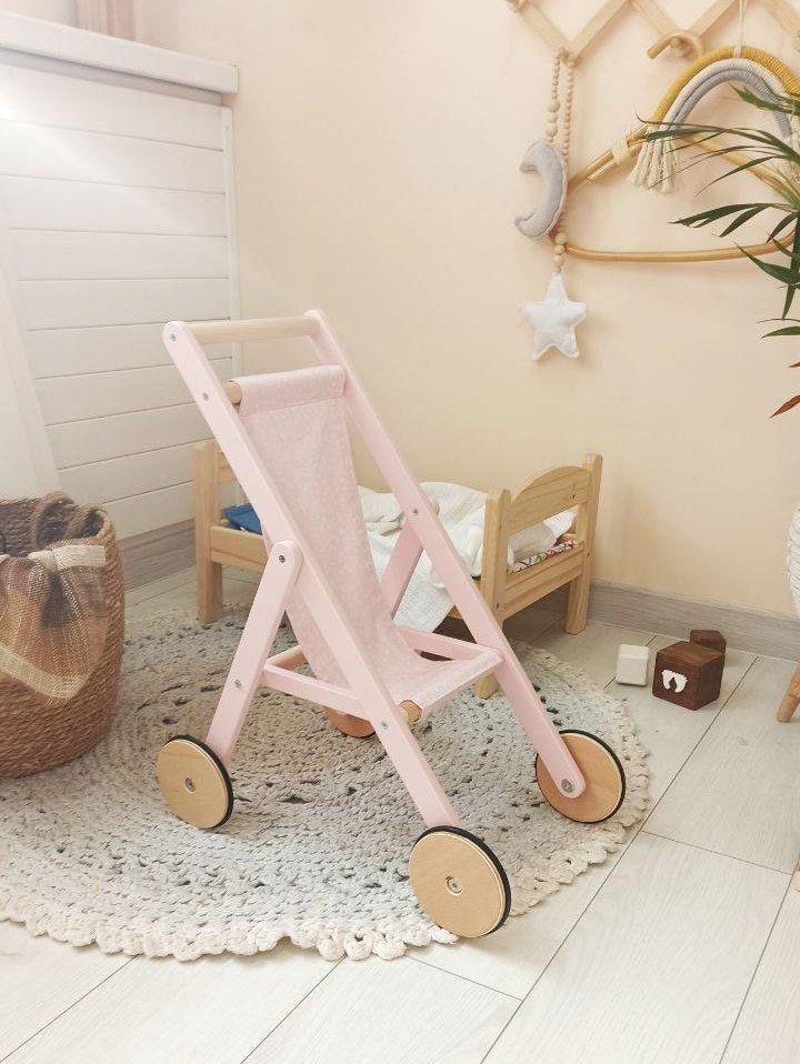 Wooden pink doll stroller with floral textile / Gift for baby girl / Wooden doll pram / Wood baby walker 1st birthday girl gift