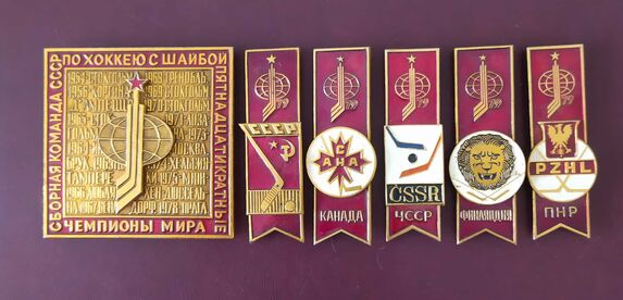 Set of badges - Ice Hockey World and European Championships. Moscow 1979. The set includes 6 badges: 1. USSR national ice hockey team and fifteen-time world champions. 2. USSR. 3. Canada. 4. Czechoslovak Socialist Republic. 5. Finland. 6. Poland. Large badges: 6.3 x 6.3 cm. Small badges: 6.5 x 2.5 cm. Materials: Aluminum, enamel.Excellent condition.