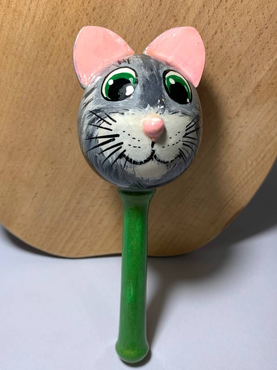 Maracas, Wooden Maracas, Musical Maracas, Painted Maracas, Maracas "Cat", Rattle "Cat", Wooden Rattle, Musical Instruments Maracas Length-17cm=6.6" Width-5.5cm=2.1" Handle length-10cm=3.9" Wooden maracas in the shape of a cat, painted with acrylics and varnished. Can also be used as a baby rattle.