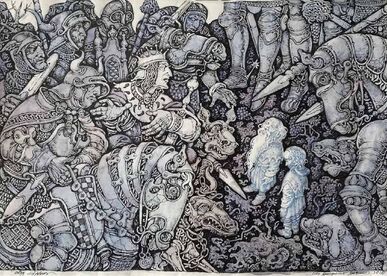 "Horsemen of the Apocalypse" 2018 Drawing by Daniil Litvinov in ink, pencil and watercolor on paper, size 43x61 cm