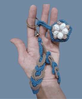 Handmade keychain made using crochet technique. Main colors: delicate blue and beige, which gives the product a stylish and universal look. The keychain consists of two parts: a decorative element in the form of a flower with white and beige petals, surrounded by a blue border, and an original woven chain. The keychain is equipped with a metal ring and a carabiner for easy attachment to keys, a bag or a backpack. An ideal accessory for those who appreciate unique and stylish handmade items.